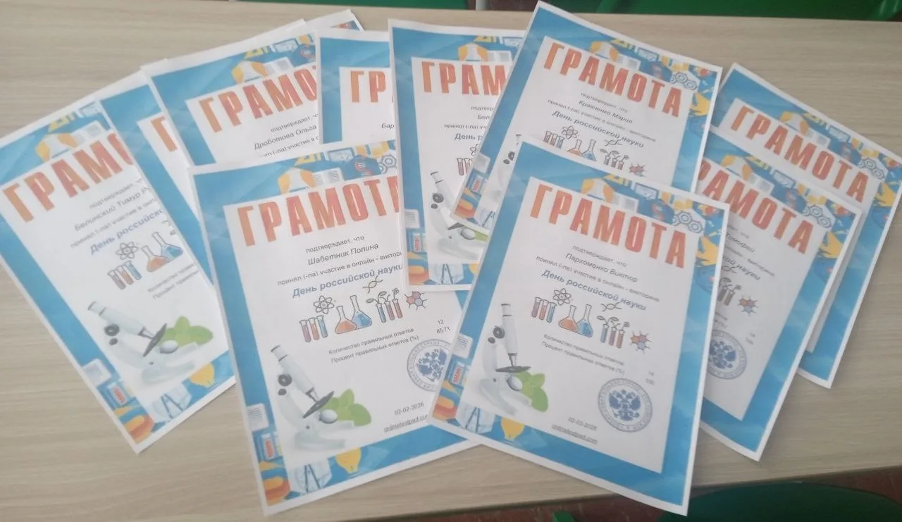 Ученики 8-А класса успешно прошли тест, посвященный Дню российской науки. Организовала участие в мероприятии Селеменева Оксана Анатольевна.