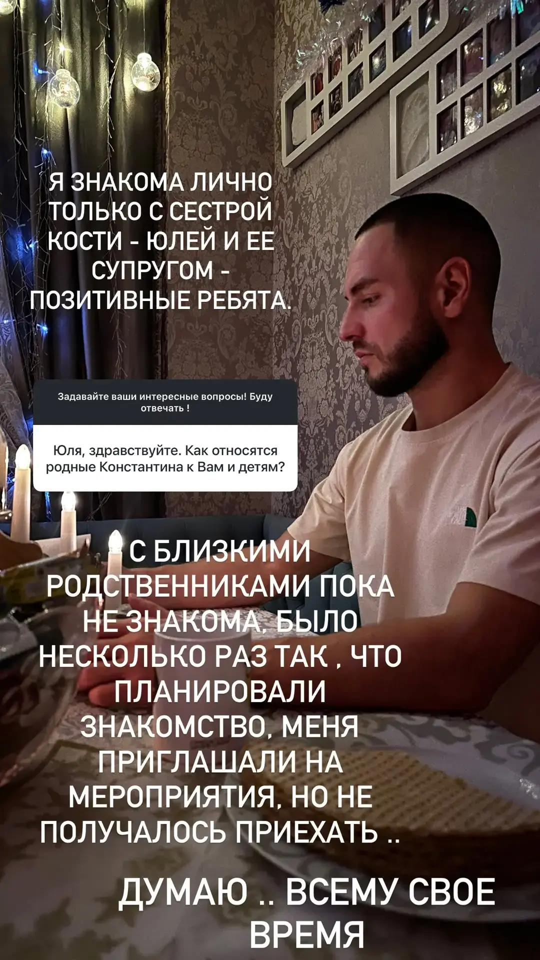 Юля Колисниченко рассказала, что со своим мужчиной пока не живут вместе и из его родственников знакома только с сестрой и её мужем. Юля призналась, что в курсе ситуации, случившейся в семье её бывшего мужа