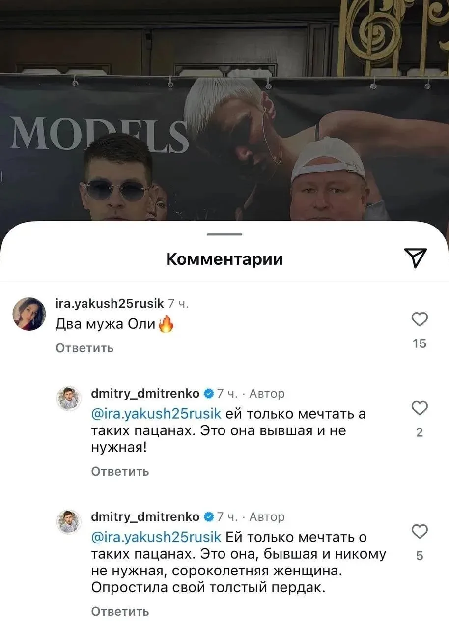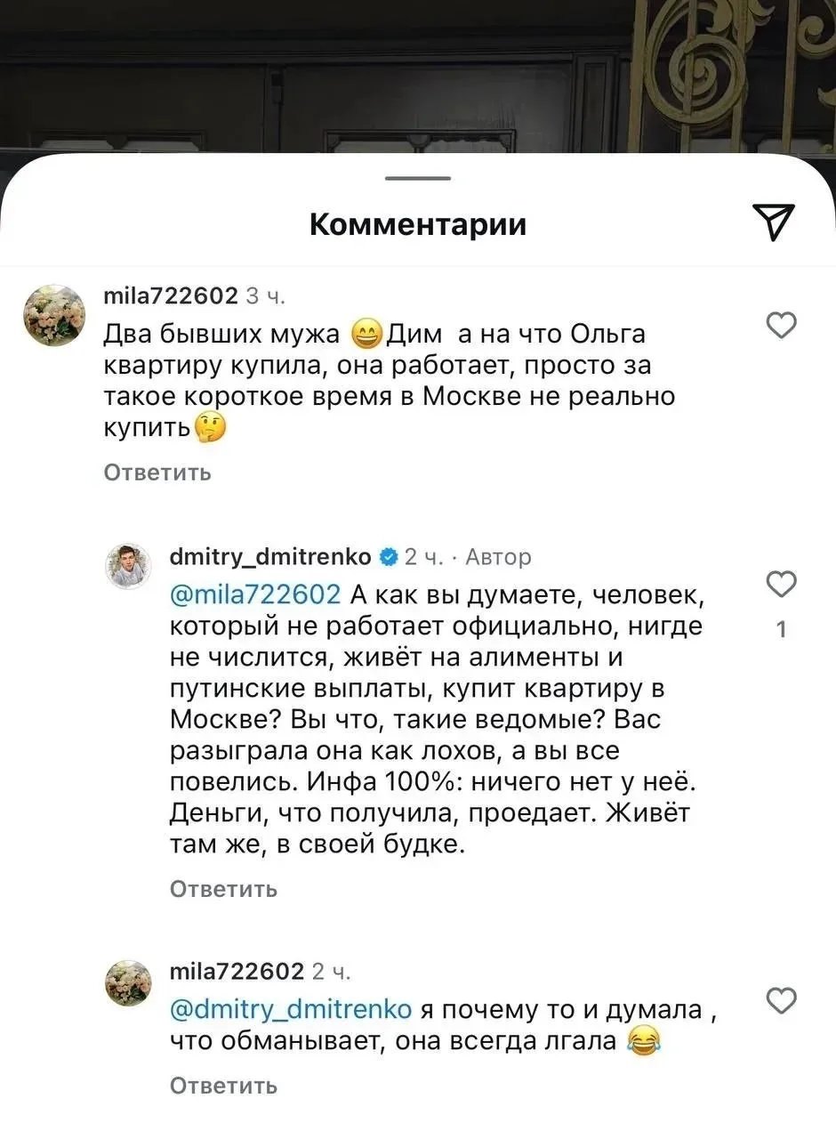 Но её бывший муж Дима Дмитренко говорит, что эта сороколетняя тётка уже что-то там себе отрастила. К тому же, Дмитренко утверждает, что Ольга врет, что купила квартиру, а гуляет на деньги от продажи совместной жилплощади.