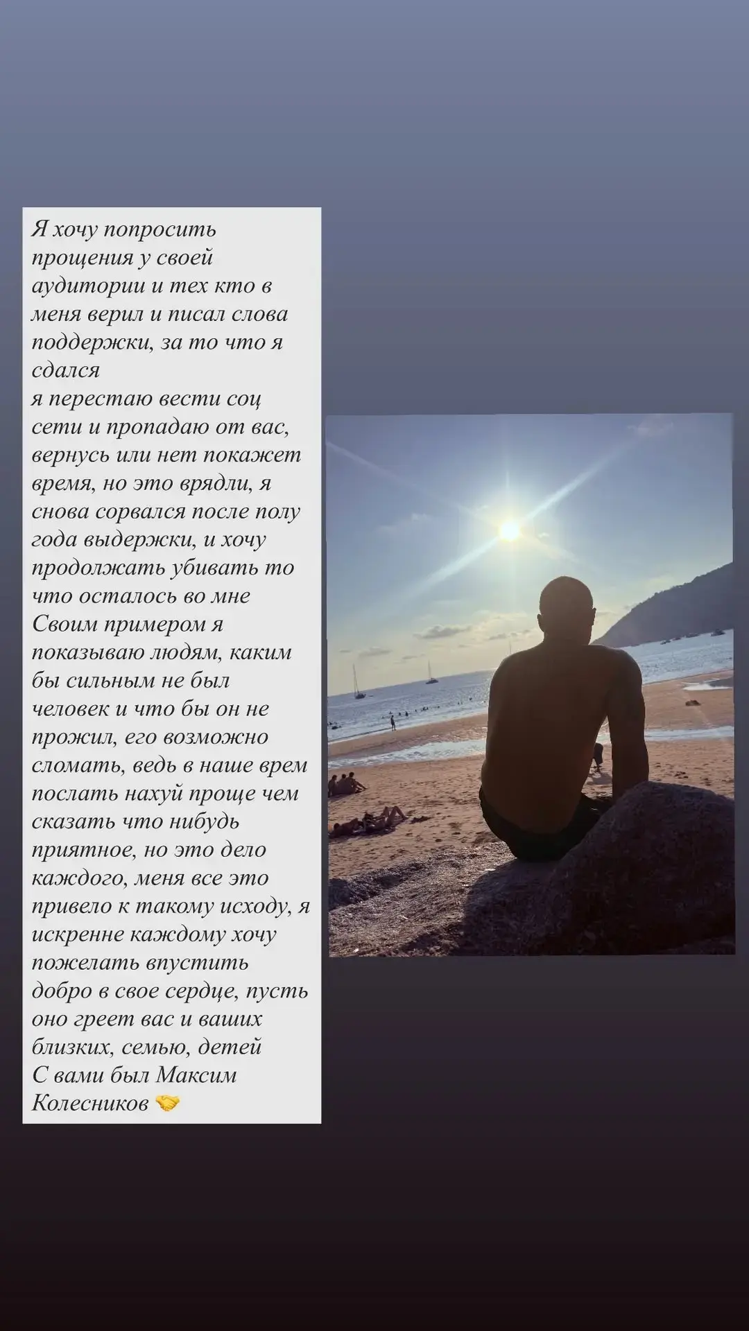 Я ухожу из соцсетей. Я хочу попросить прощение у каждого из вас, кто в меня верил. Я снова сорвался после полугода выдержки.