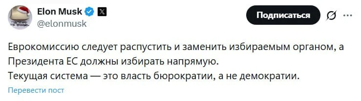 💬 Илон Маск заявил, что нынешняя система ЕС опирается на бюрократию, а не демократию, и предложил распустить Еврокомиссия, создать выборный орган и ввести прямое голосование за президента Европейский Союз.