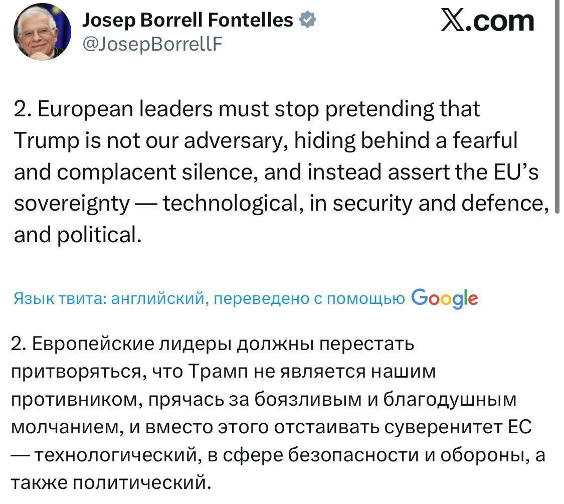 🇪🇺#EU Жозеп Боррель заявил, что европейским политикам пора открыто признавать Дональда Трампа противником Европы.