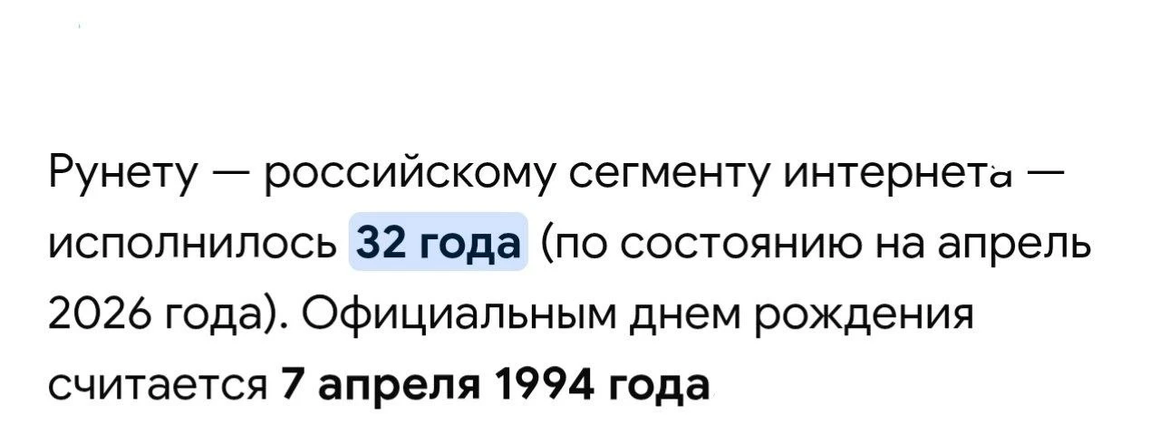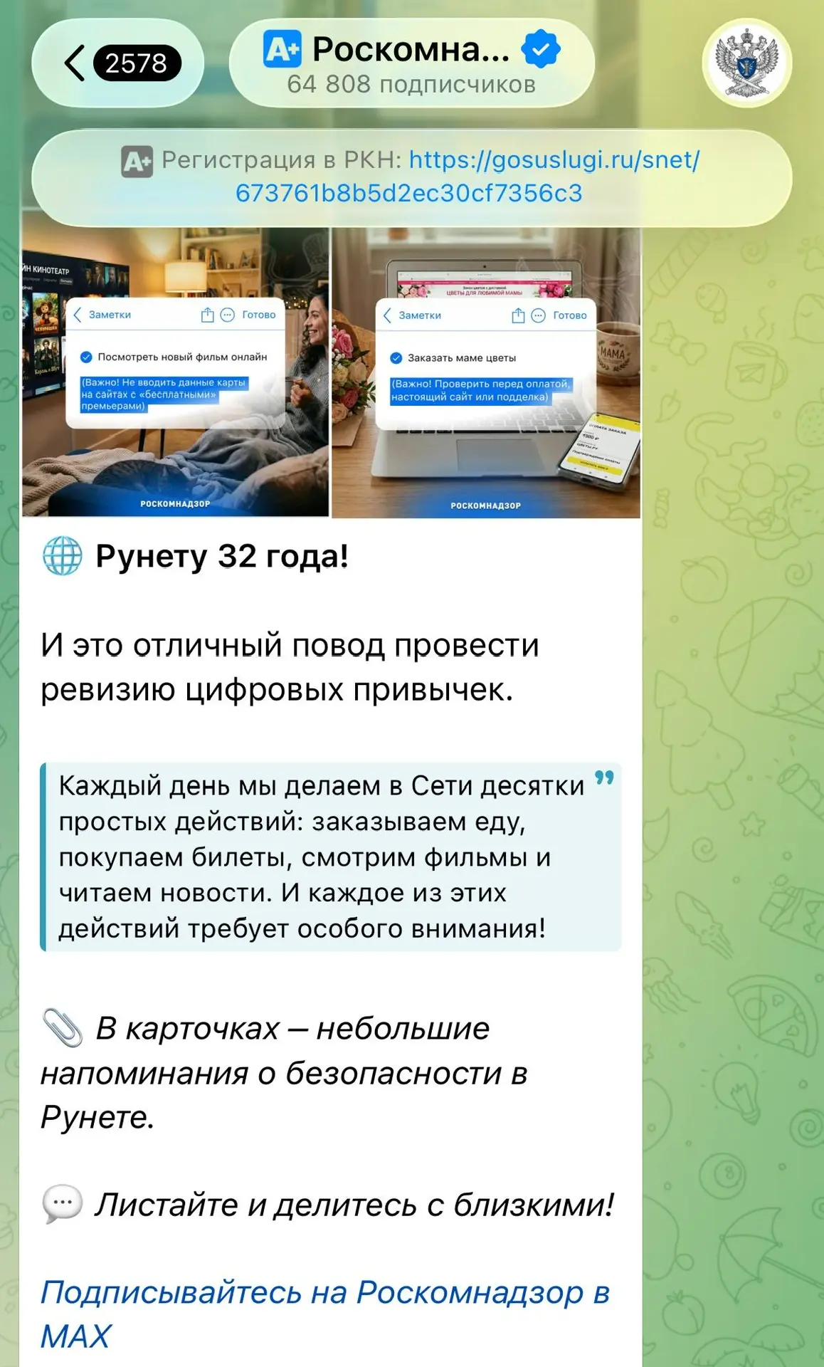 Роскомнадзор поздравил россиян с 32-летием Рунета в своём Telegram-канале.