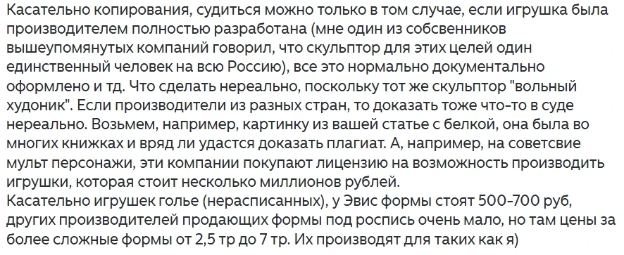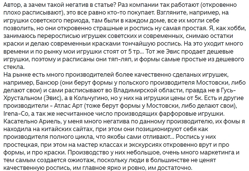 В 23-м году на Дзене у меня вышла статья, где я рассуждаю о нелепом копировании игрушек. Упор, конечно, был на завод Эвис. Они начали с очень страшных игрушек, потом перешли к копированию игрушек разных производителей, но сейчас, слава Богу, обзавелись штатом профессионалов и ситуация изменилась. Теперь Эвис разрабатывает свои уникальные игрушки, и качество росписи отличное (про стекло и серебрение пока промолчу😀) . И вдруг к старой статье такой новый комментарий. Чего человека так триггернуло, что он такую простынь накатал? И да, гольё по 500-700 рублей - это недорого? Я тот же Эвис покупала рублей по 200 ранее а сегодня вижу гольё даже по 1600 у них. Наверное, для людей, занимающихся переросписью игрушек, такая туфта - счастье (считай, фронт работы). А я за то, чтобы изначально наши производители выпускали красивые качественные игрушки и не по цене крыла самолёта желательно