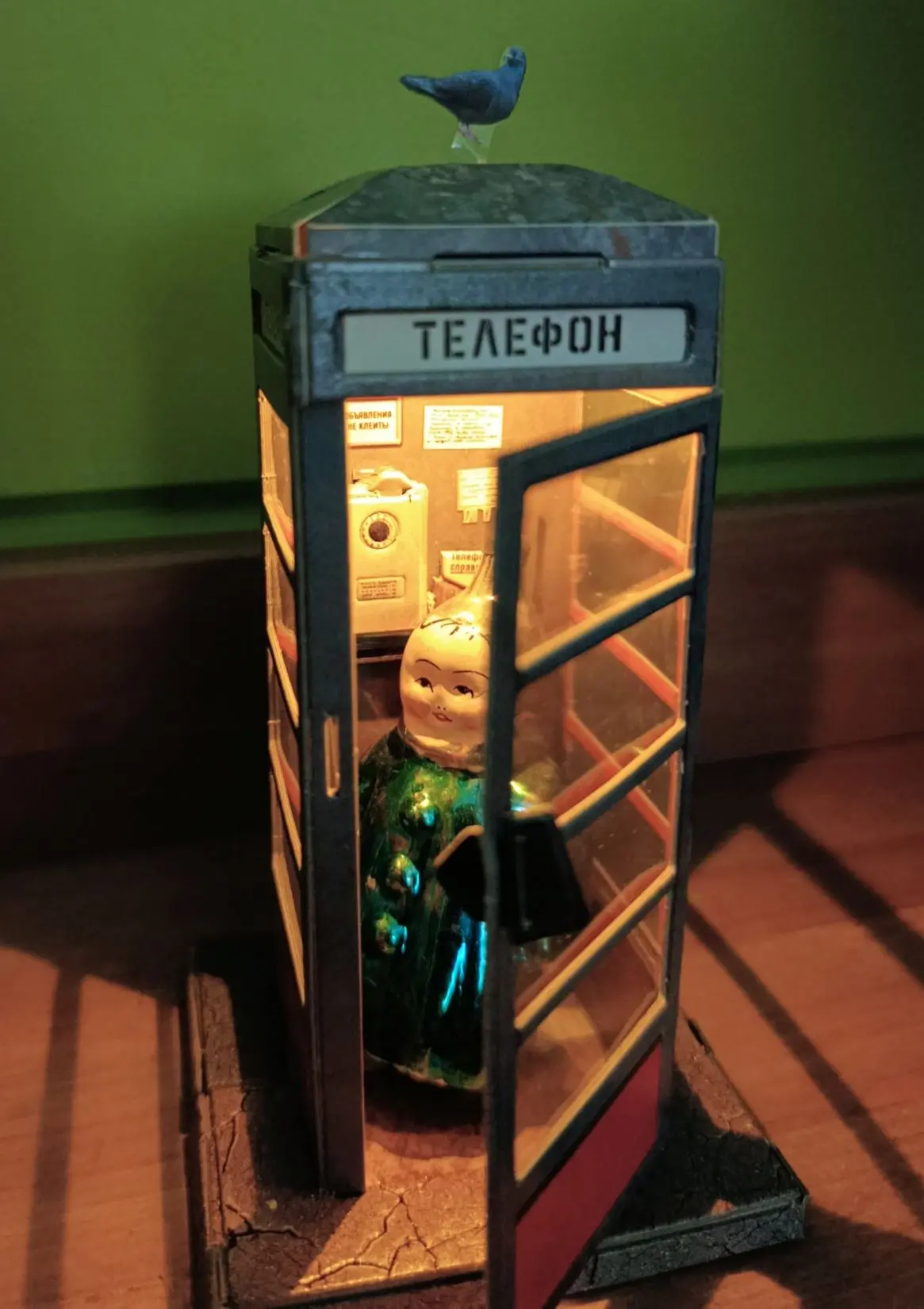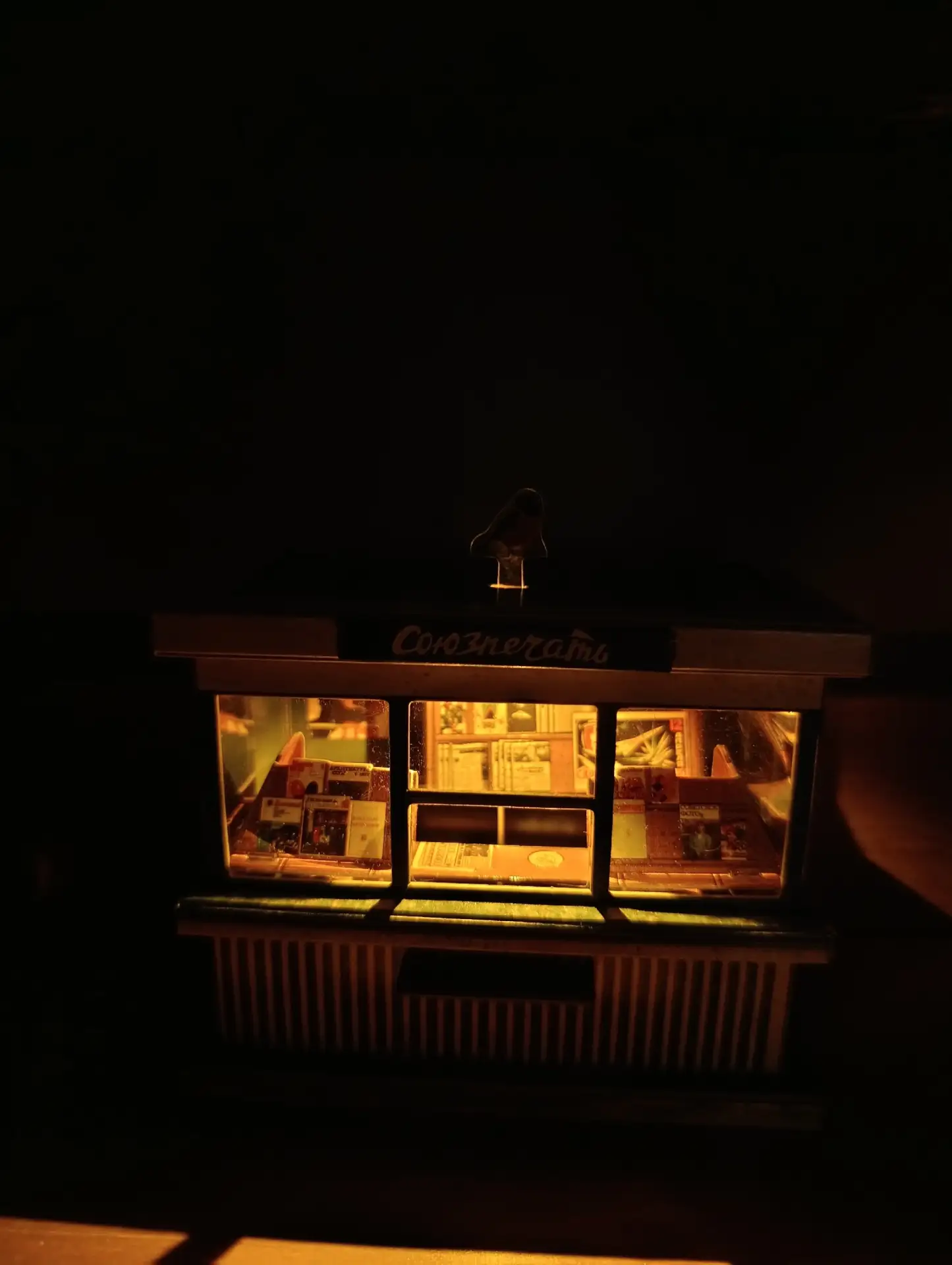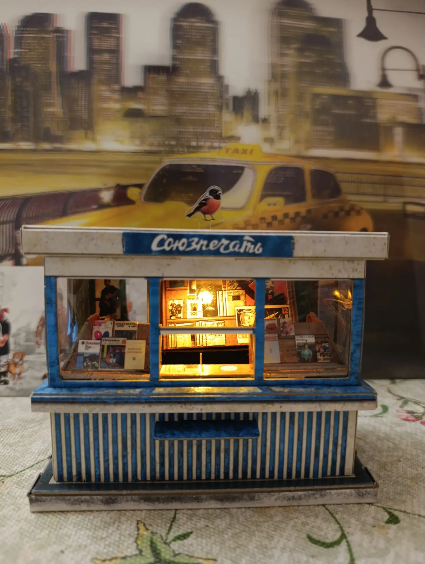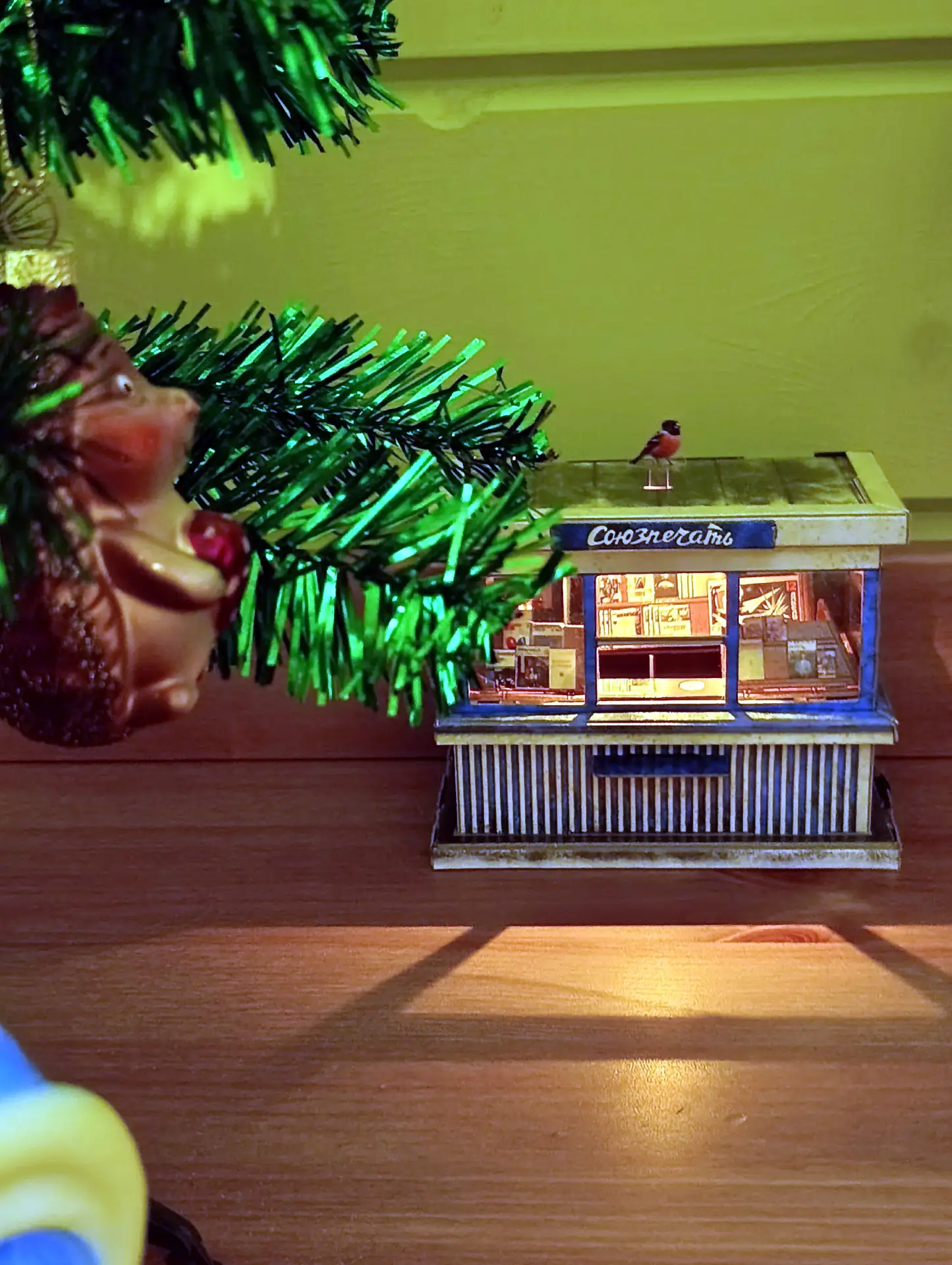 Наконец-то приехали фонарики для моих сборных моделек. Я купила киоск и телефонную будку, но в одной упаковке не было фонарика, а в другой он сломался. Решила не сдаваться и купила ещё одну будку, но она тоже приехала без фонарика. Заказала фонарики на Озоне, но пока они ехали, я где-то в доме потеряла телефонные будки (убрала, называется) Но киоск собрала. Теперь думаю - как бы его к ёлке приспособить