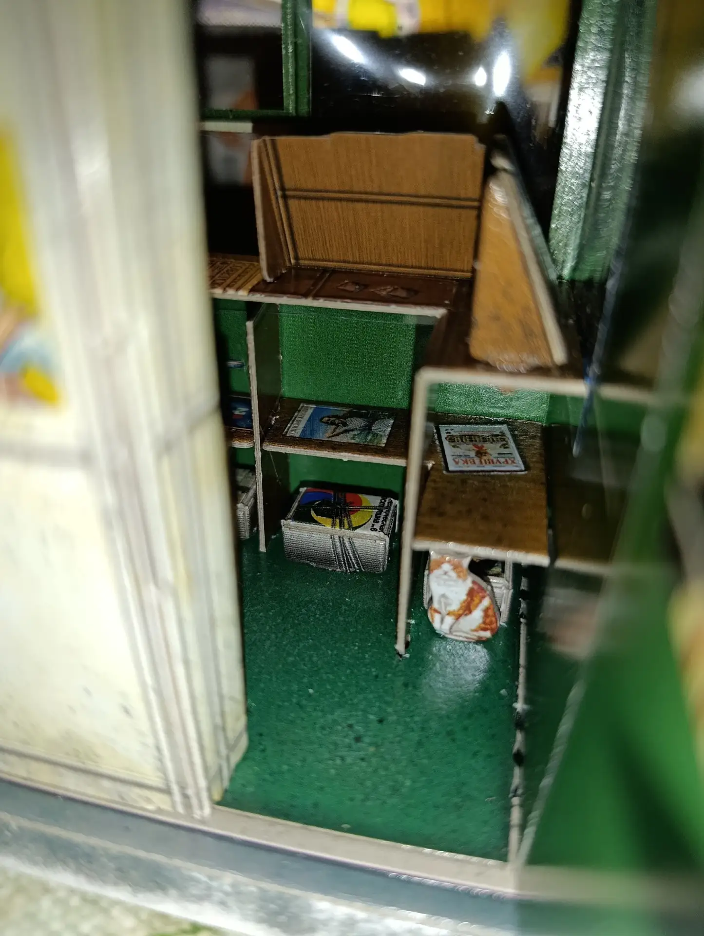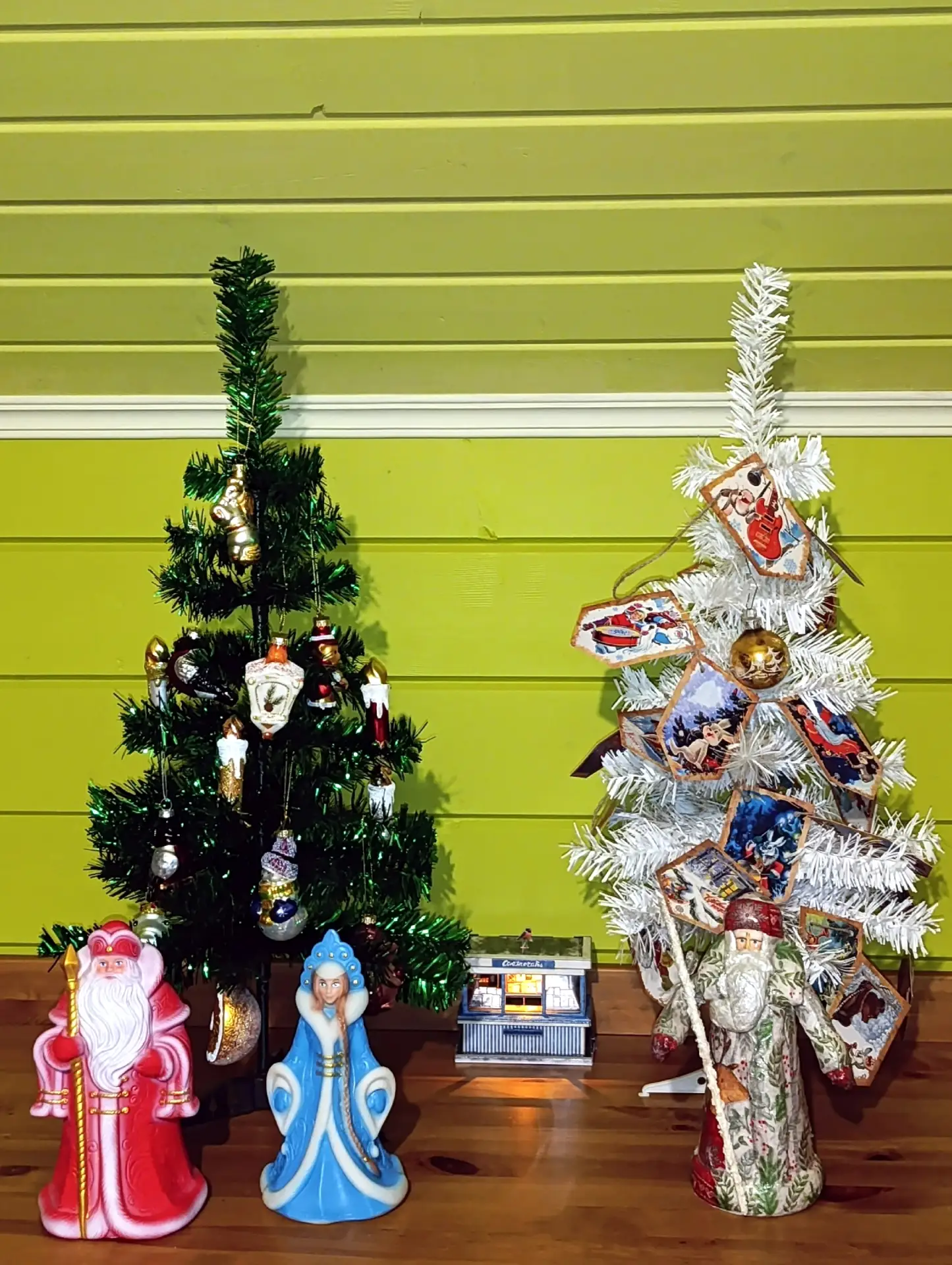 В соседней комнате идёт ремонт полным ходом, из-за которого забарахлили мою игрушечную. Но я разгребла поверхность комода и начала создавать себе новогоднюю атмосферу. Ёлки и игрушки из Фикспрайса, уникальные флажки по открыткам Зарубина от подписчика, ватный Дед Мороз от Аллы Одинцовой, киоск от Умной бумаги (сейчас ещё телефонную будку соберу)
