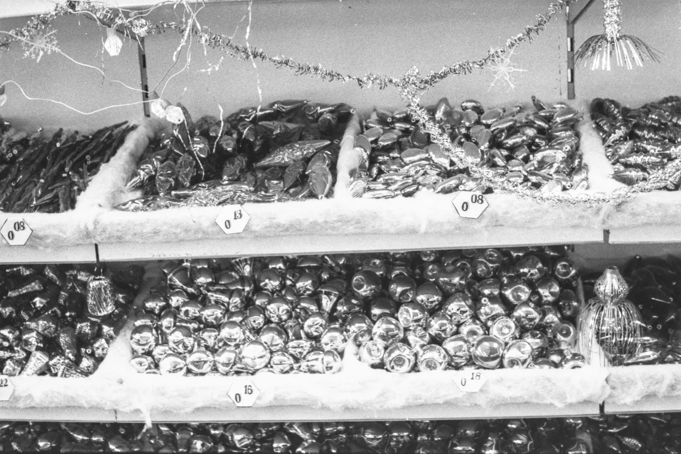 Я уже рассказывала, что у меня в детстве было всего 4 формовые игрушки (и два колокольчика). Мало у кого были ёлки-витрины. С удовольствием рассматриваю ёлки наряженные исключительно дорогими игрушками, но сама такую не хочу. Рассмотреть я и у себя в коробочках могу. Возвращаюсь снова, как в детстве, к шарикам и подвескам. А сколько денег надо было, чтобы нарядить ёлку, допустим, году в 79-м? Вот фотография из магазина - Северодвинск, 1979 год