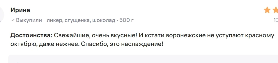 У меня Новый год не наступит, если не будет конфет "Столичные". Год назад у нас была жуткая ситуация - муж 2 месяца мотался по реанимациям. Купить московские конфеты просто не успела, срок доставки был после НГ. В последний момент купила белорусские. На удивление белорусские понравились больше. А сейчас вижу воронежские "Столичные". На НГ покупать не буду из-за фантика - на праздничном столе должны быть конфеты в классической бумажной обёртке. Но попробовать воронежские хотелось бы. Кто покупал - похожи они на классику или нет?