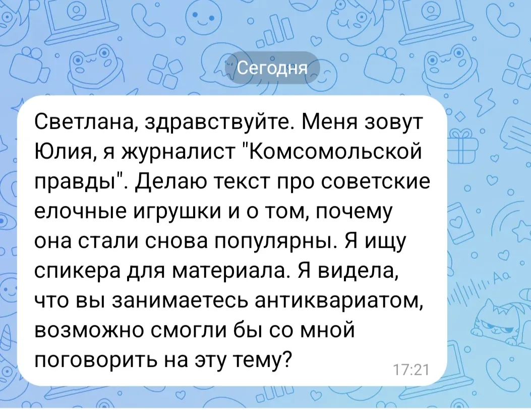 В последние дни мне в личку приходит много сообщений с просьбой рассказать про игрушки, дать интервью, записать видео и тыпы. Не обижайтесь, уважаемы редакторы, но это не моё. Я и коллекционером-то себя не считаю. Я больше изучатель😀 Пока в интернете обнаружила 2 интервью со мной. Но если в первый раз я с девушкой говорила, советовала, куда ей обратиться, но даже не подумала, что из разговора надёргают фраз и выпустят интервью, которого не было. То во второй раз со мной НИКТО не связывался вообще. Просто тупо на моём дзен-канале насобирали отдельные фразы и фотографии и вуаля! Зареклась общаться с различными изданиями в любой форме. https://msk1.ru/text/winter/2024/01/03/72937367/?ysclid=mixdkmp7bd283065694