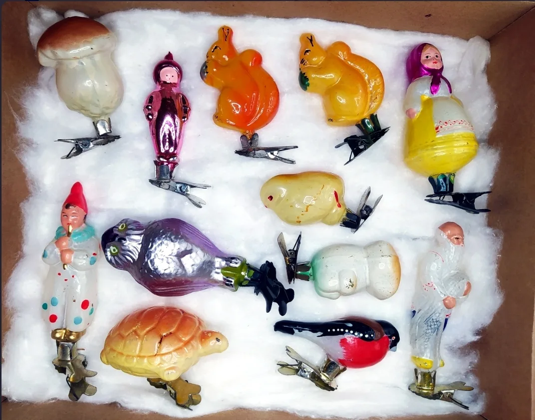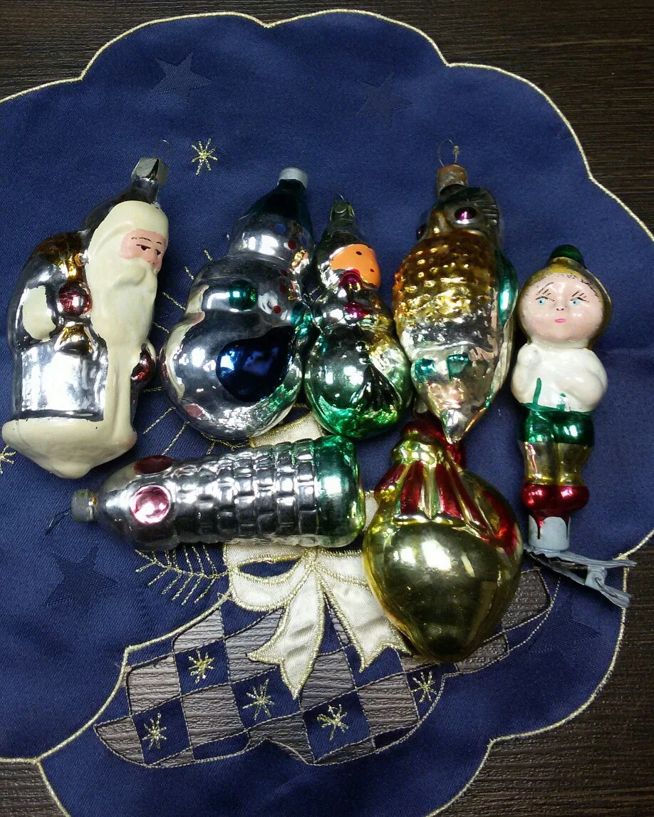 Продолжение. Итак, было принято решение купить коробку со старыми стеклянными шариками. Где их брать-то? Полезла в интернет, в ВК обнаружила несколько тематических сообществ, где продавали старые игрушки. И тут я офигела. Я не представляла, что в СССР было такое количество формовых игрушек. На моей ёлке их было 4 штуки: клубничка, Красная шапочка, немецкая птичка и Весна (две последних сохранились, две первых потом докупила). Долго выбирала продавца, тогда каждый день разоблачали мошенников. В итоге выбрала Лиду из Уфы и заказала у неё первые свои игрушки, в которых ничего не понимала ещё. У Лиды уже были сформированы наборы для начинающих. Сейчас бы, наверное, такие не купила, но тогда была довольна как слон. Потом купила у Лиды овощной набор и выбрала игрушки из предлагаемых. Обратите внимание - на 2-м фото часики и царь-град уфимские. По поводу деда с 4-й фотки, я тыкала в него пальцем и просила положить мне этого немца. Лида удивлялась, говорила, что немецких нет. А я в итоге оказалась почти права🤣