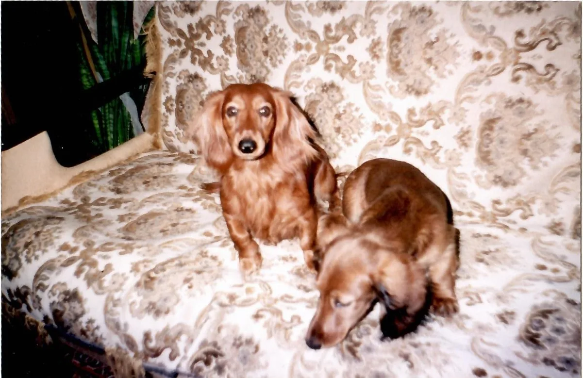Это Данка и её дочь Джинка. У Джинки нет ни одной нормальной фотографии, потому что при виде фотоаппарата она начинала удирать. Данка (Даная) - моя первая собака. Именно с её появлением я стала собирать фигурки такс. В середине 90-х нас постоянно спрашивали про породу или про то, метис каких пород у меня. Длинношёрстная такса была редкостью. Потом у меня была карликовая жесткошёрстная такса, после неё я зареклась заводить собак. А через год мы купили маламута.