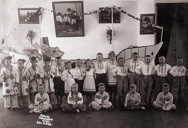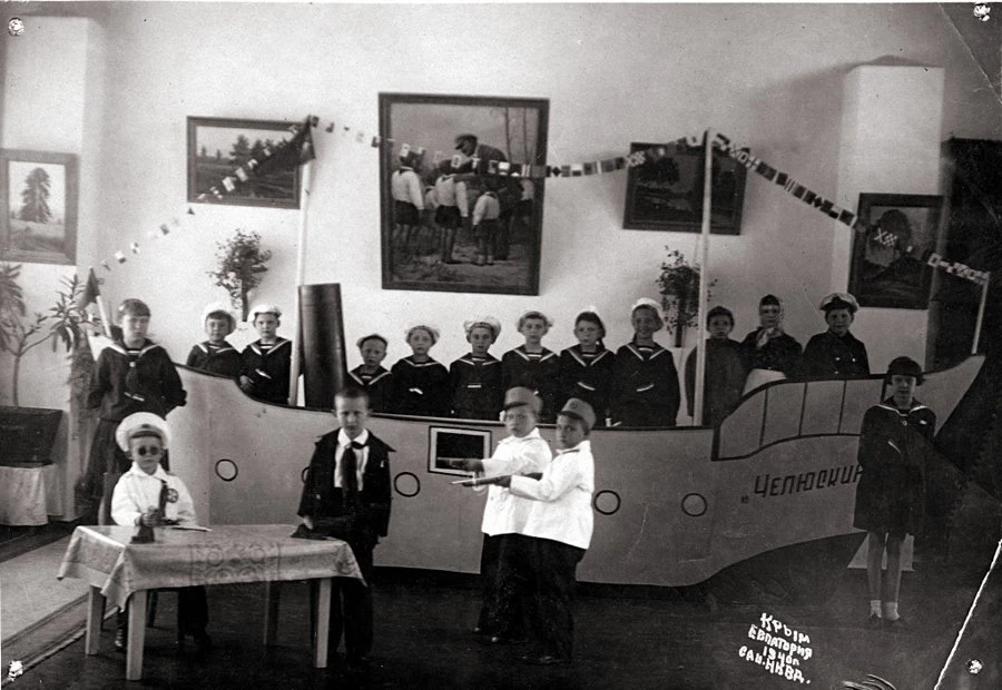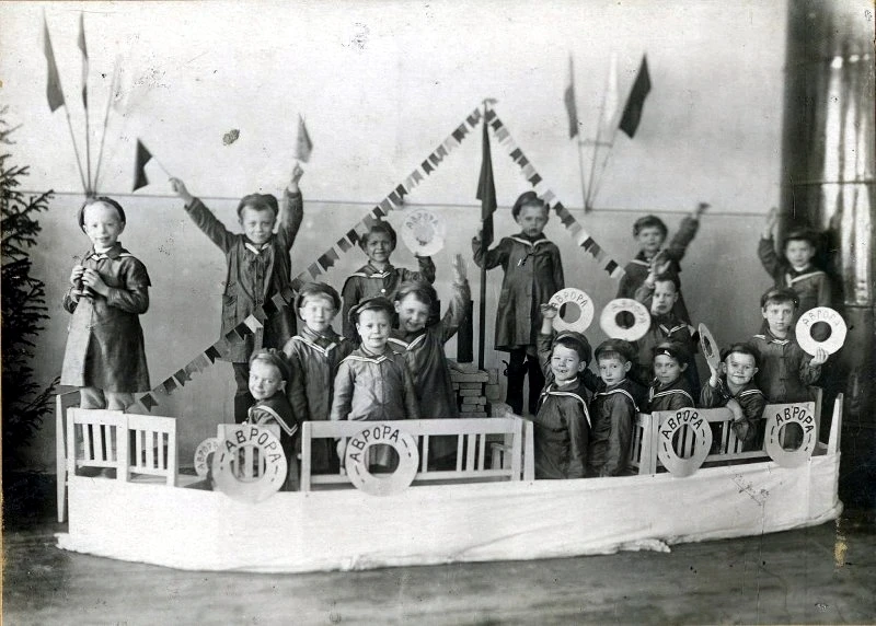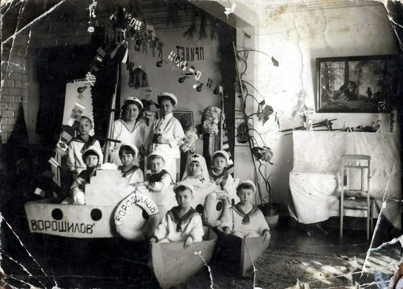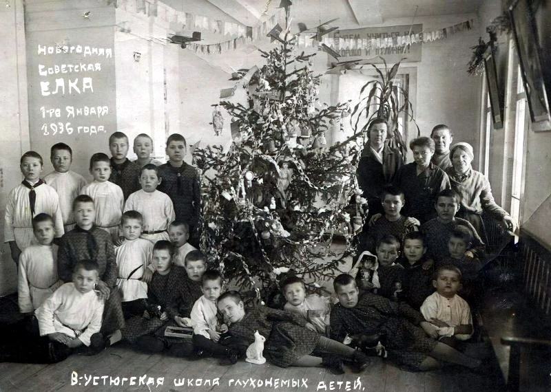Первая советская ёлка. "Обучающиеся школы глухонемых у новогодней елки в г.Великий Устюг, 01.01.1936 г." (Госкаталог.РФ) Праздновать Новый год официально разрешили 28 декабря 1935 года. Ни учреждения, ни промышленность элементарно не успели подготовиться. Старые "царские" игрушки на ёлку вешать уже нельзя, а новых игрушек ещё нет. Под ёлкой сидит зайчик, а посередине ёлки виднеется кукла. И, конечно же, бумажные цветные цепочки. Если что, то мы в школе на продлёнке тоже их клеили, хотя дефицита игрушек уже не было