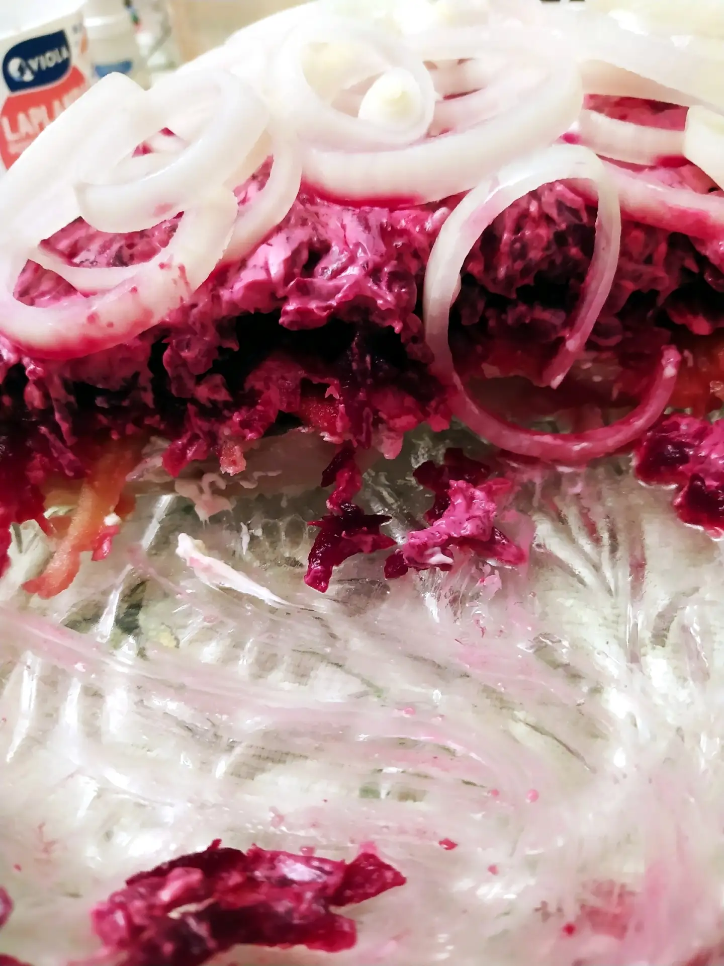Рецепт селёдки. Смотрю на фото - в 21-м селёдка была покупная в виде филе, салатник какой-то полупустой. Свёклу "варю" в пакете для запекания в микроволновке. Ставлю 10 минут на максимум, потом добавляю по 5 минут. Ели при протыркивании чуть жестковата, то ставлю 3 минуты. Но я обычно 3 свёклы сразу запекаю, мы любим сырно-свекольный салат. Ещё вопросы про салатник были. Это советский, но они и сейчас продаются. Бахметьевская хрустальная шубница 24х16 один в один по размеру, но есть из разных материалов https://dzen.ru/a/YboABDTUTVTHI6QI