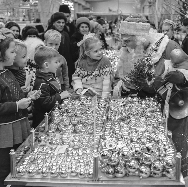 Очень люблю эту фотографию, она сделана ещё до моего рождения, но мои новогодние праздники были точно такими же. И снова хочу обратить внимание на доступность ёлочных игрушек. На шариках лежит ценник - 6 копеек. А за детьми стоят взрослые, похоже, они тоже верят в Деда Мороза😀