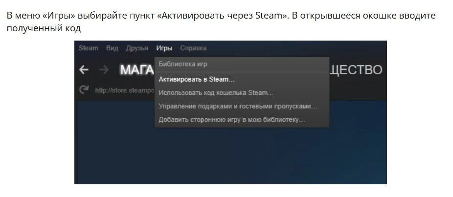 Инструкция по активации в Steam прикреплена в качестве скриншота.