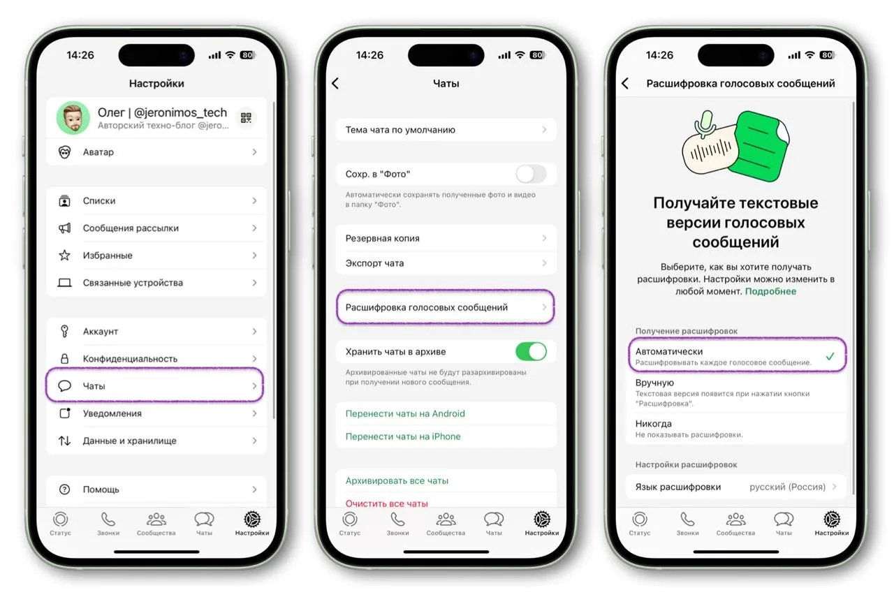 В целом мессенджеры справляются с этой задачей довольно однотипно: любители войсов могут легко и быстро их записывать, а противники — расшифровывать в текст. WhatsApp позволяет это сделать бесплатно, а Telegram попросит купить подписку Premium за возможность транскрибировать аудио либо вовсе запретить их получение.
