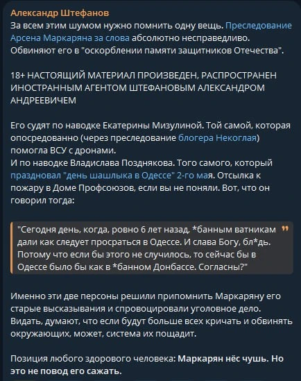 Ин. агент Штефанов заступился за Маркоряна. Мол, нельзя сажать за слова.