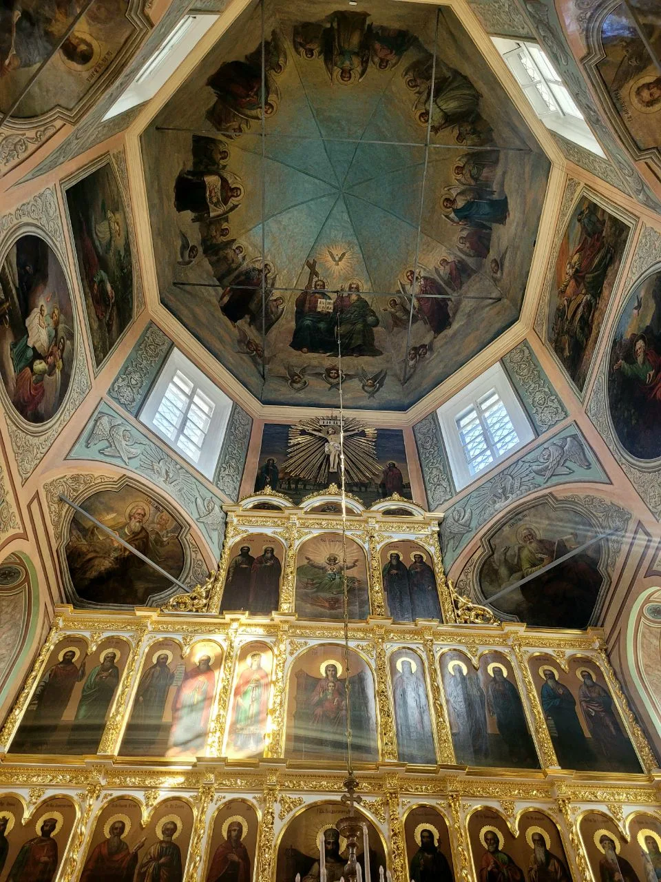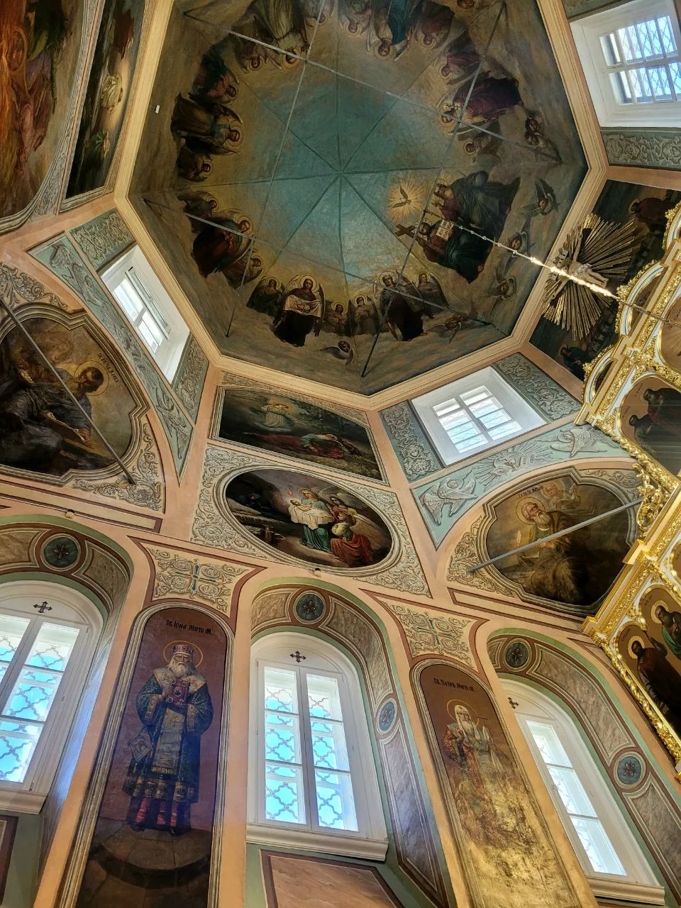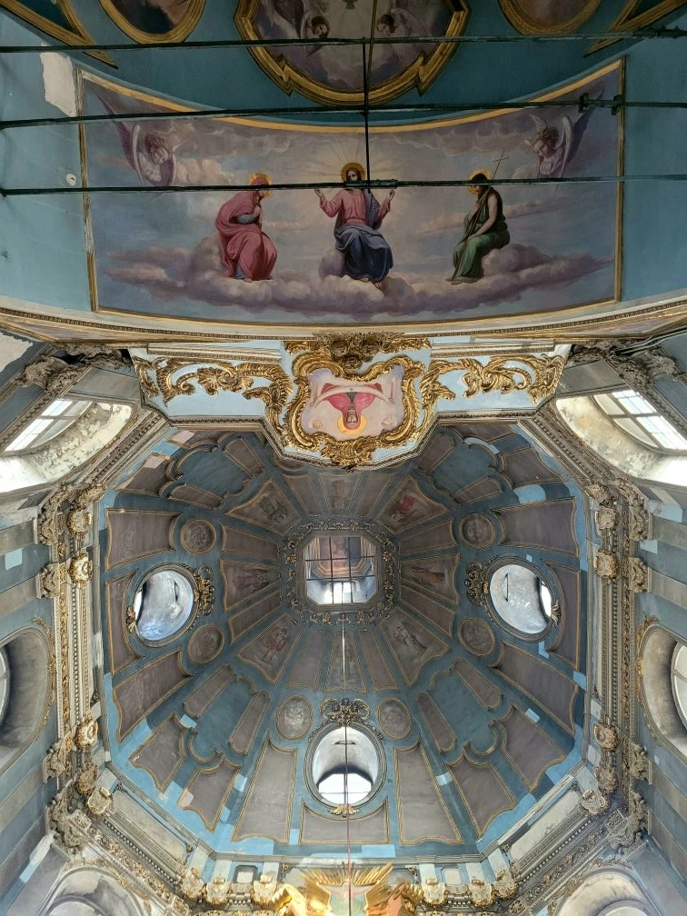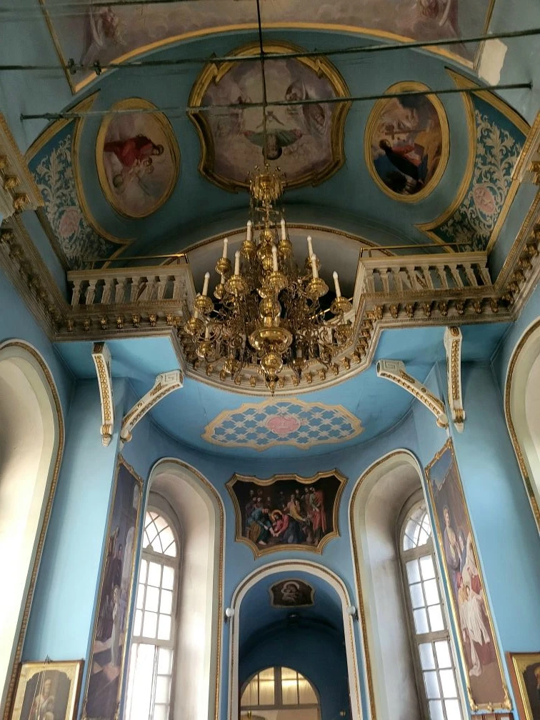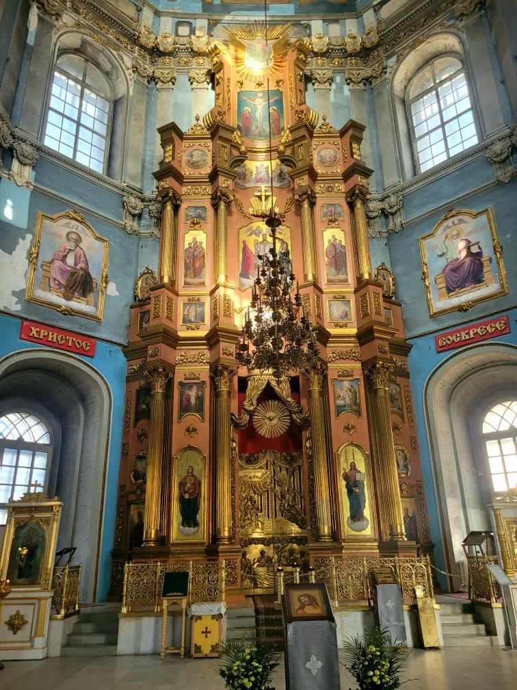 Внутри необыкновенно красиво. Многоярусный иконостас, резные золоченые царские врата, прекрасные росписи, свод в виде купола неба. Сохранилась редкая барочная лепнина.