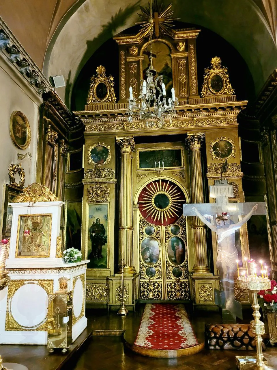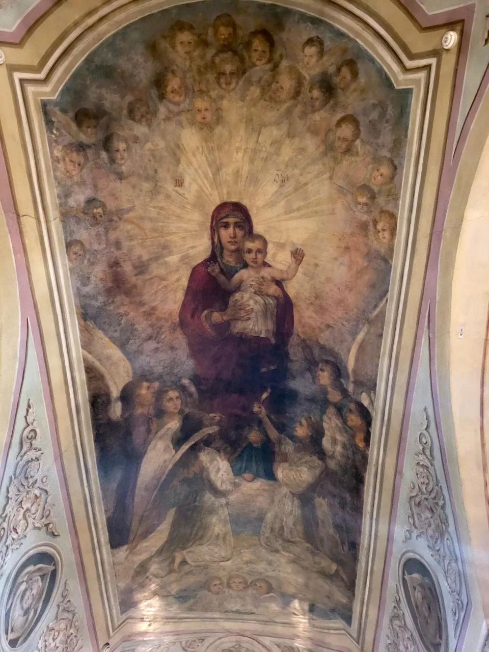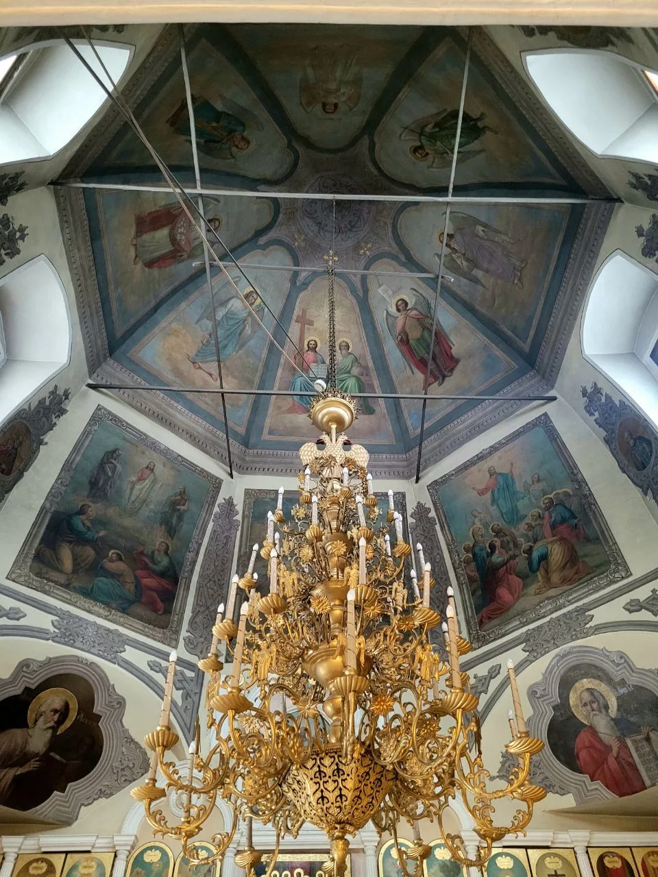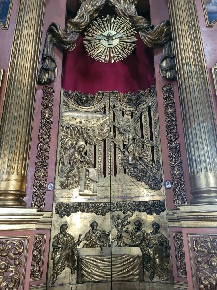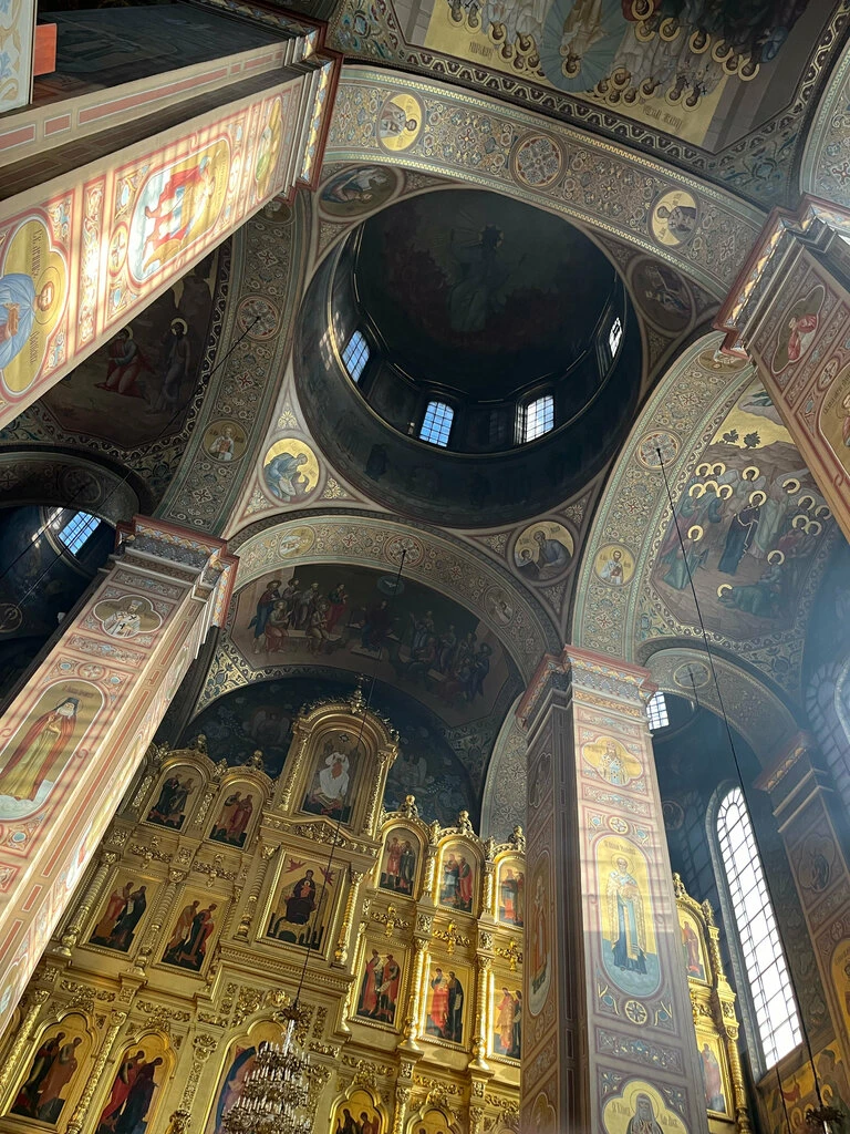 Внутри необыкновенно красиво. Многоярусный иконостас, резные золоченые царские врата, прекрасные росписи, свод в виде купола неба. Сохранилась редкая барочная лепнина.