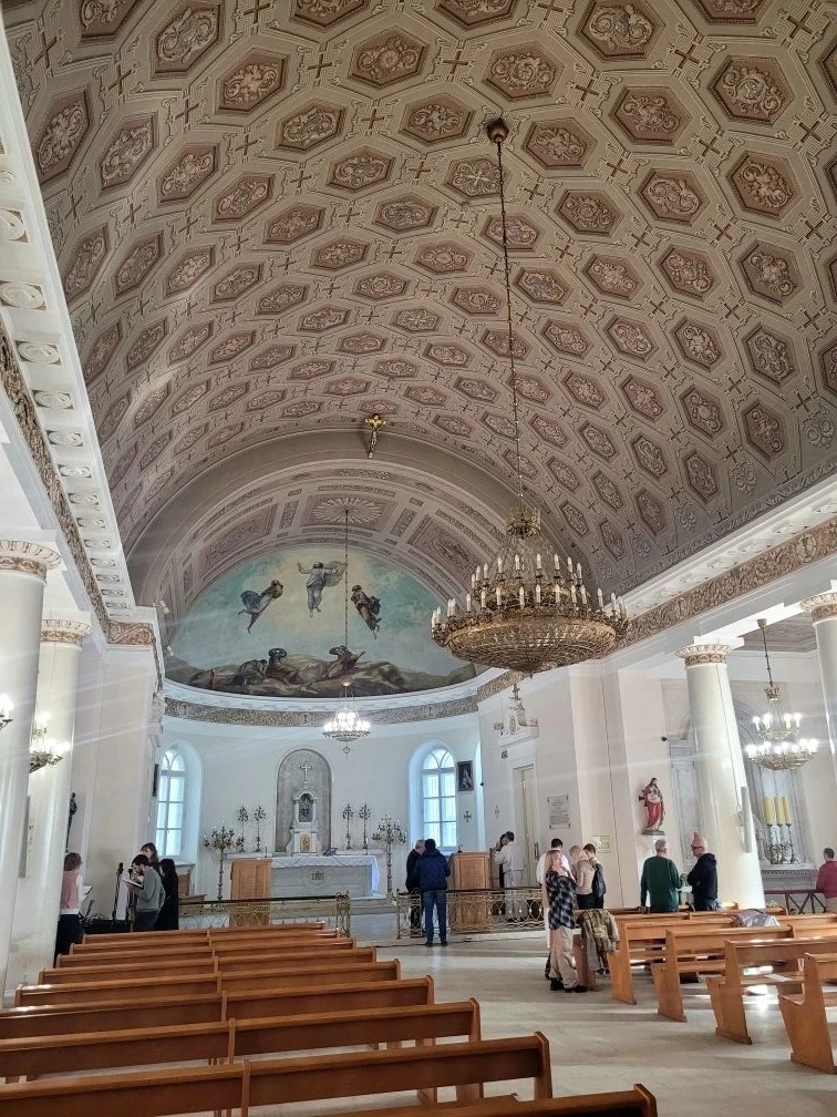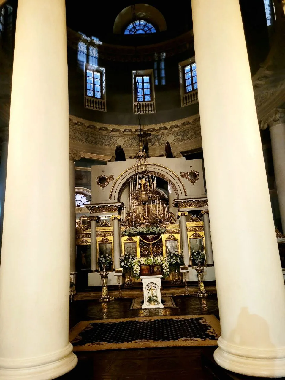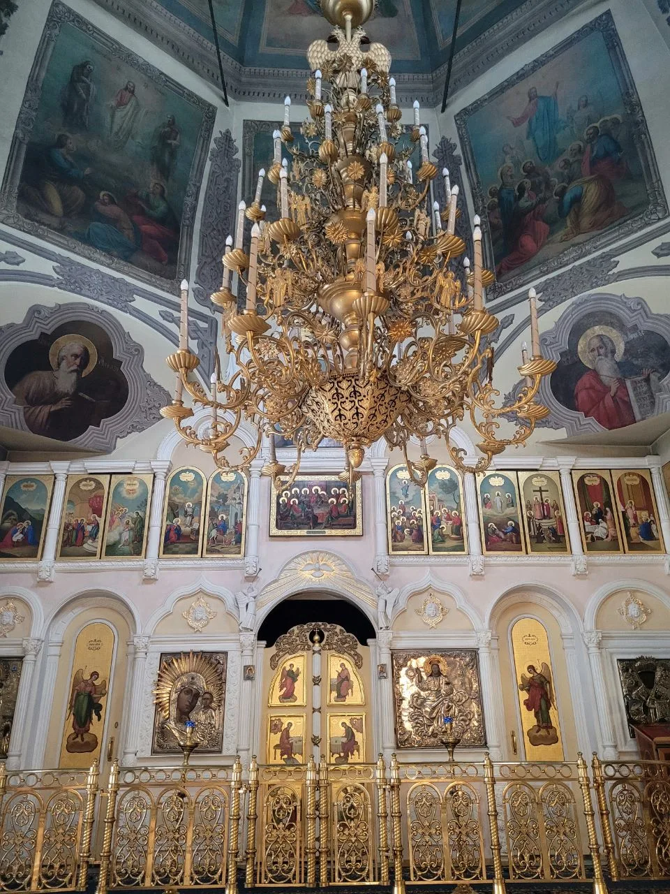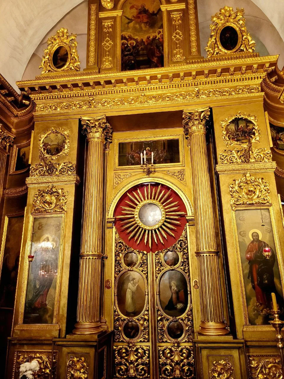 Внутри необыкновенно красиво. Многоярусный иконостас, резные золоченые царские врата, прекрасные росписи, свод в виде купола неба. Сохранилась редкая барочная лепнина.