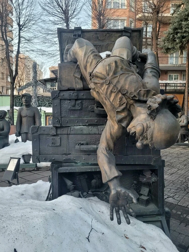 Экспозиция очень разноплановая. На улице, во внутреннем дворике, представлены скульптуры. Каких только исторических деятелей и наших современников там нет - от Марины Цветаевой на лавочке до Юрия Лужкова в наряде дворника!