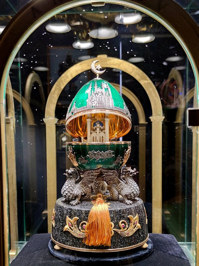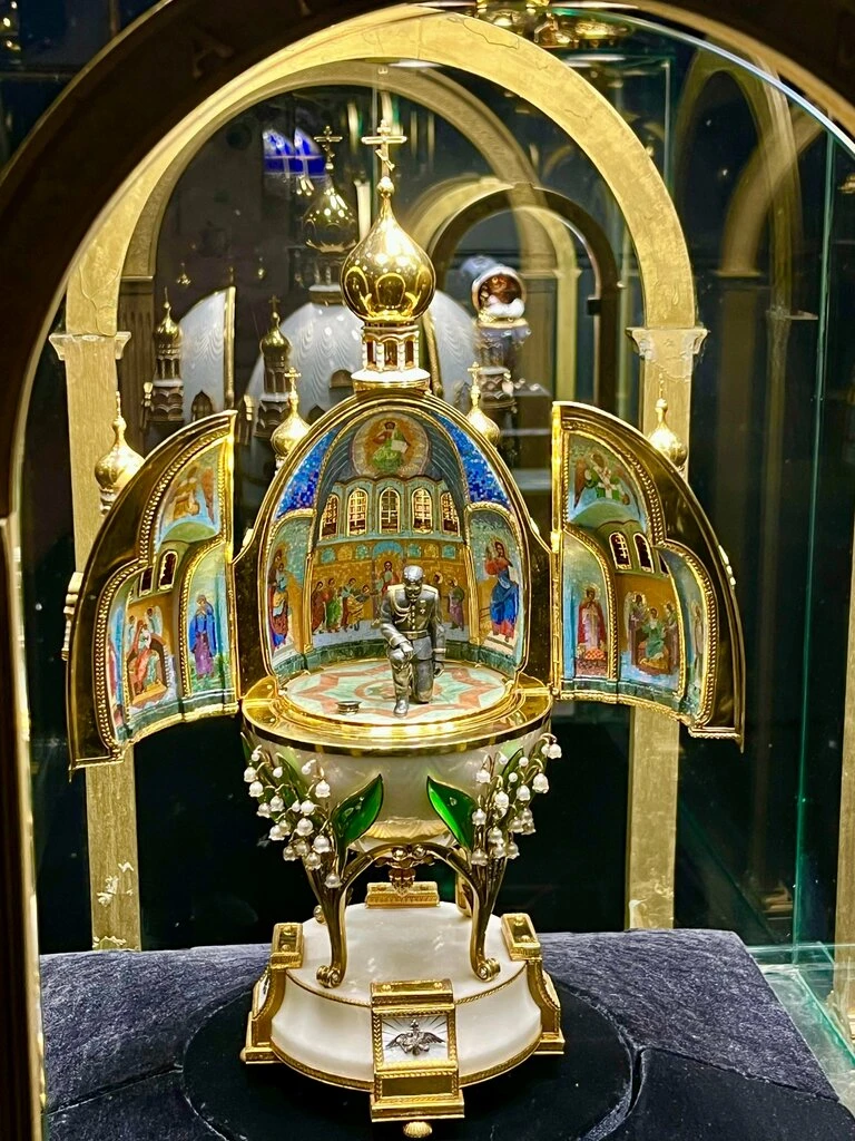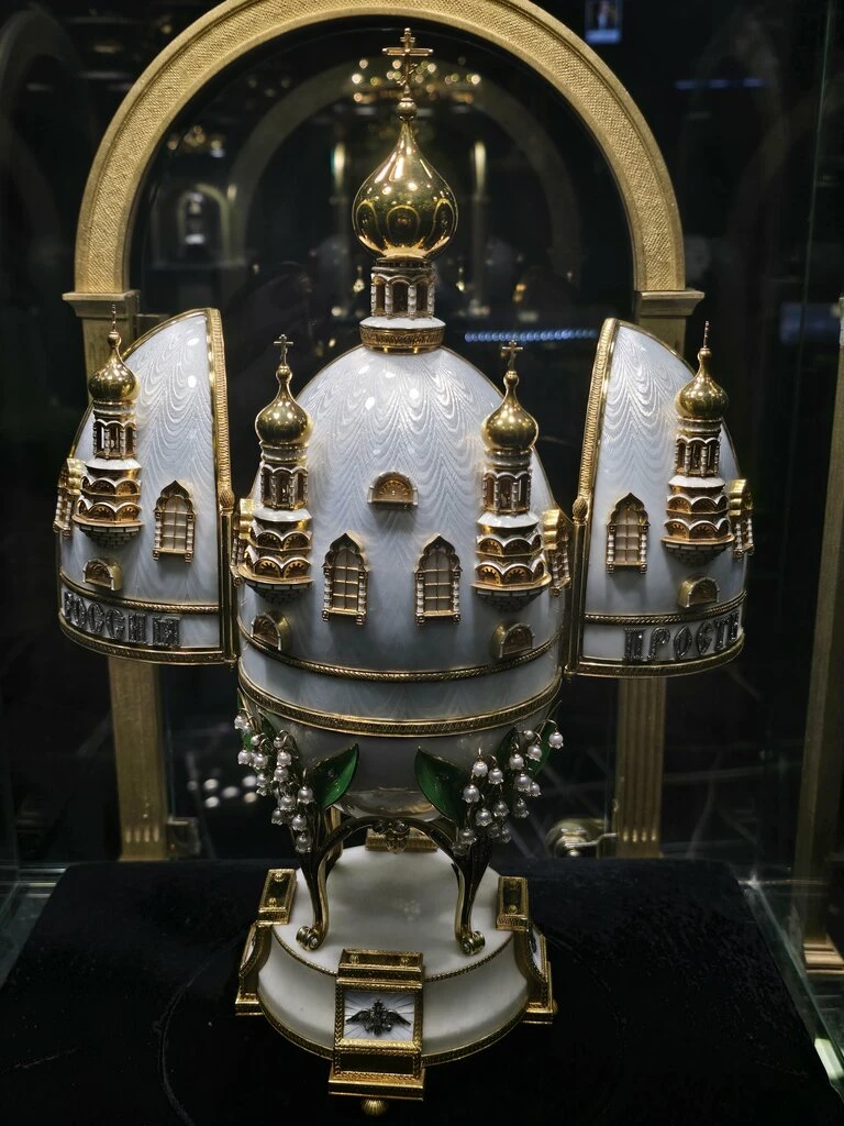 В музее много потрясающе красивых ювелирных изделий: от украшений до птиц, сделанных из драгоценных камней. Настоящий восторг у подруги вызвали знаменитые русские храмы внутри пасхальных яиц.