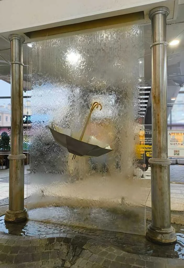 Так как северная столица входит в десятку самых пасмурных городов Европы, ничего удивительного в возведении такого памятника нет. Монумент представляет собой перевернутый зонт, надвое рассеченный стеклом, по которому стекают потоки воды на мостовую. Вода, кстати, здесь настоящая, так как эта инсталляция – фонтан.