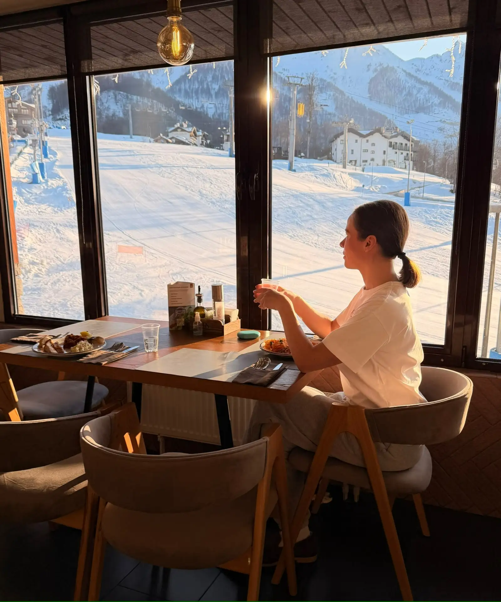 Поселились в отеле прямо на склоне и каждый день завтракаем и ужинаем с прекрасным видом 😍