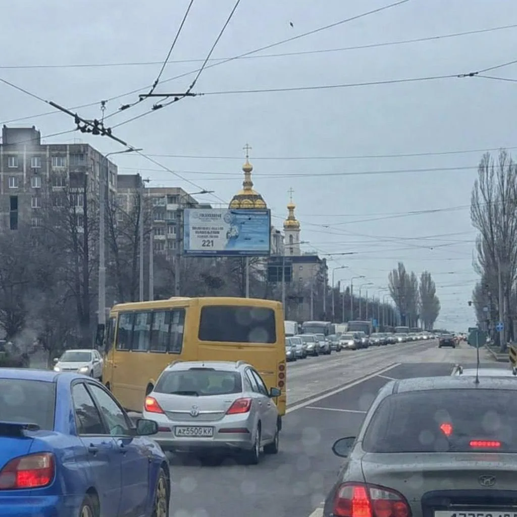 Очень плотное движение на Ленинском проспекте в Донецке. Машины тянутся от Олимпиева до Золотого кольца.