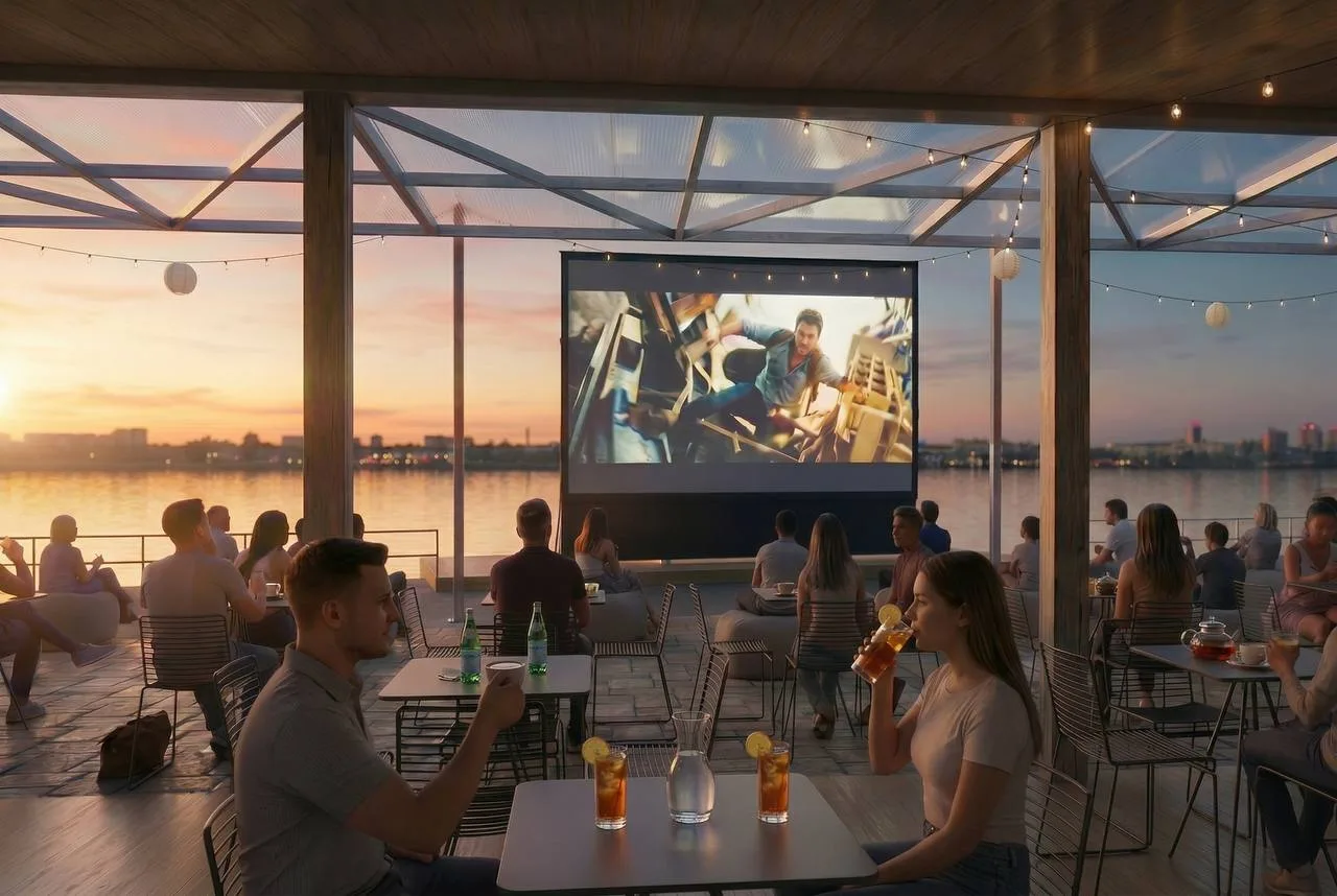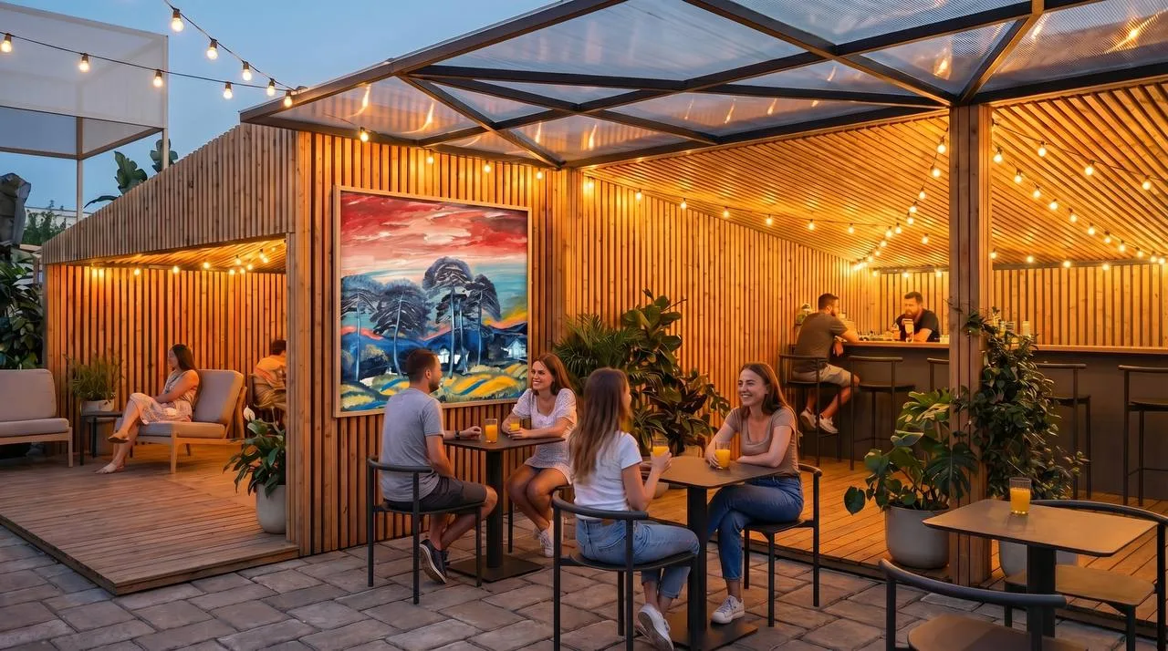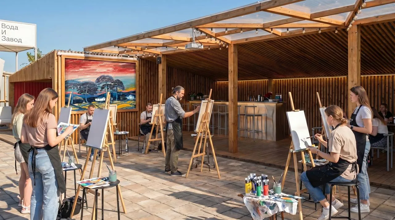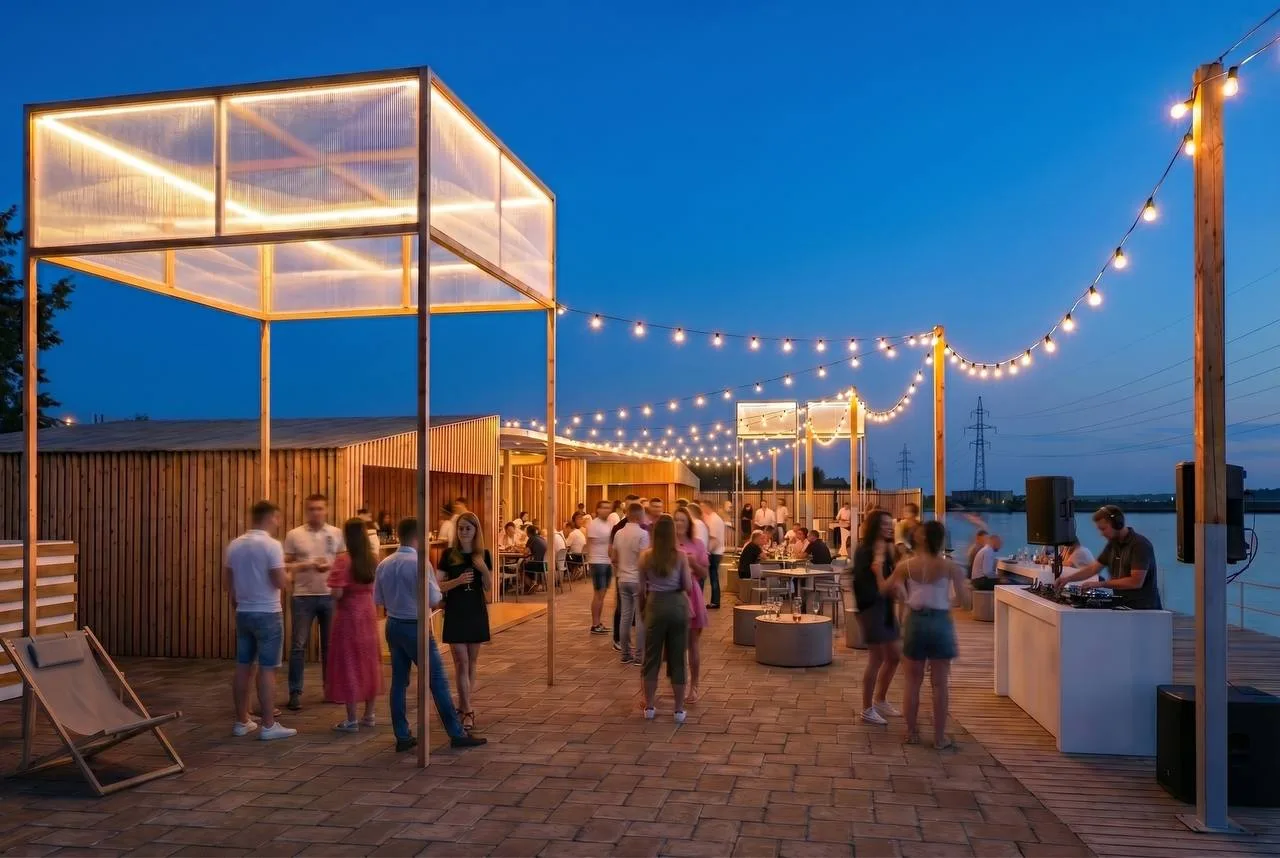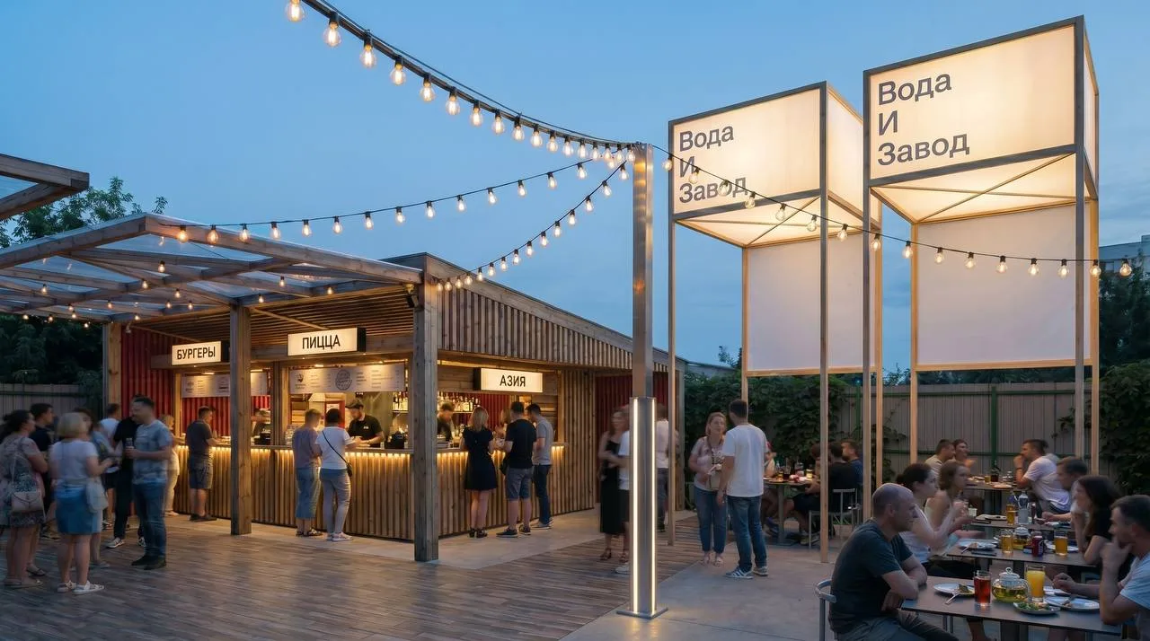 Днем площадка будет как уютное место для отдыха. Можно поработать с чашкой кофе, встретиться с друзьями или поиграть в теннис. А вечером будут проводить мероприятия под открытым небом — показывать кино, читать лекции, устраивать концерты и проводить занятия по йоге и медитации.