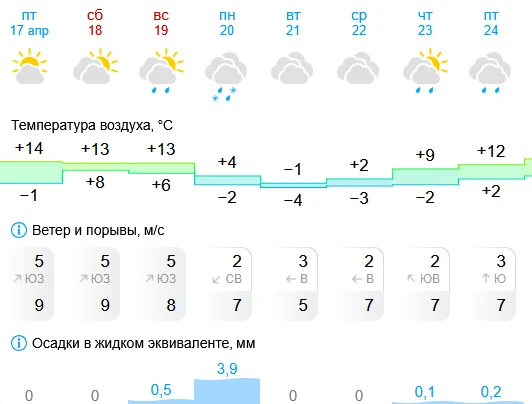— 19 апреля: ночью +3°С, днем +6°С, возможен дождь.