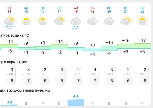 После потепления до +13°С резко похолодает. Уже в понедельник на следующей неделе пойдет дождь со снегом: ночью до -2°С, днем около +4°С. Ко вторнику снова вернется минус — до -1°С даже днем.