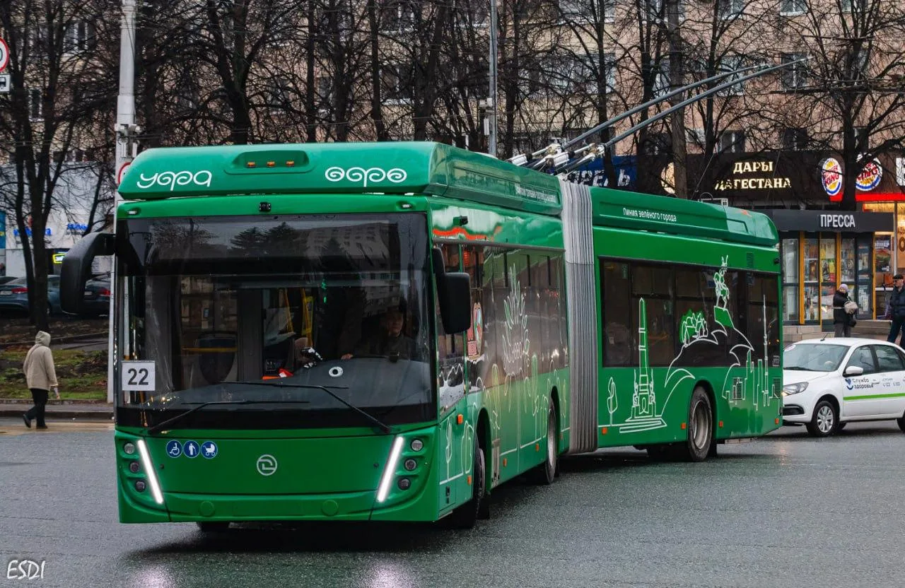 Машину выпускает Уфимский трамвайно троллейбусный завод на базе автобуса «МАЗ». Длина троллейбуса 18,2 метра, как у автобуса гармошки, в салоне помещается до 150 пассажиров. Он может проехать до 40 километров без подзарядки и работать при температуре до минус 40 градусов.