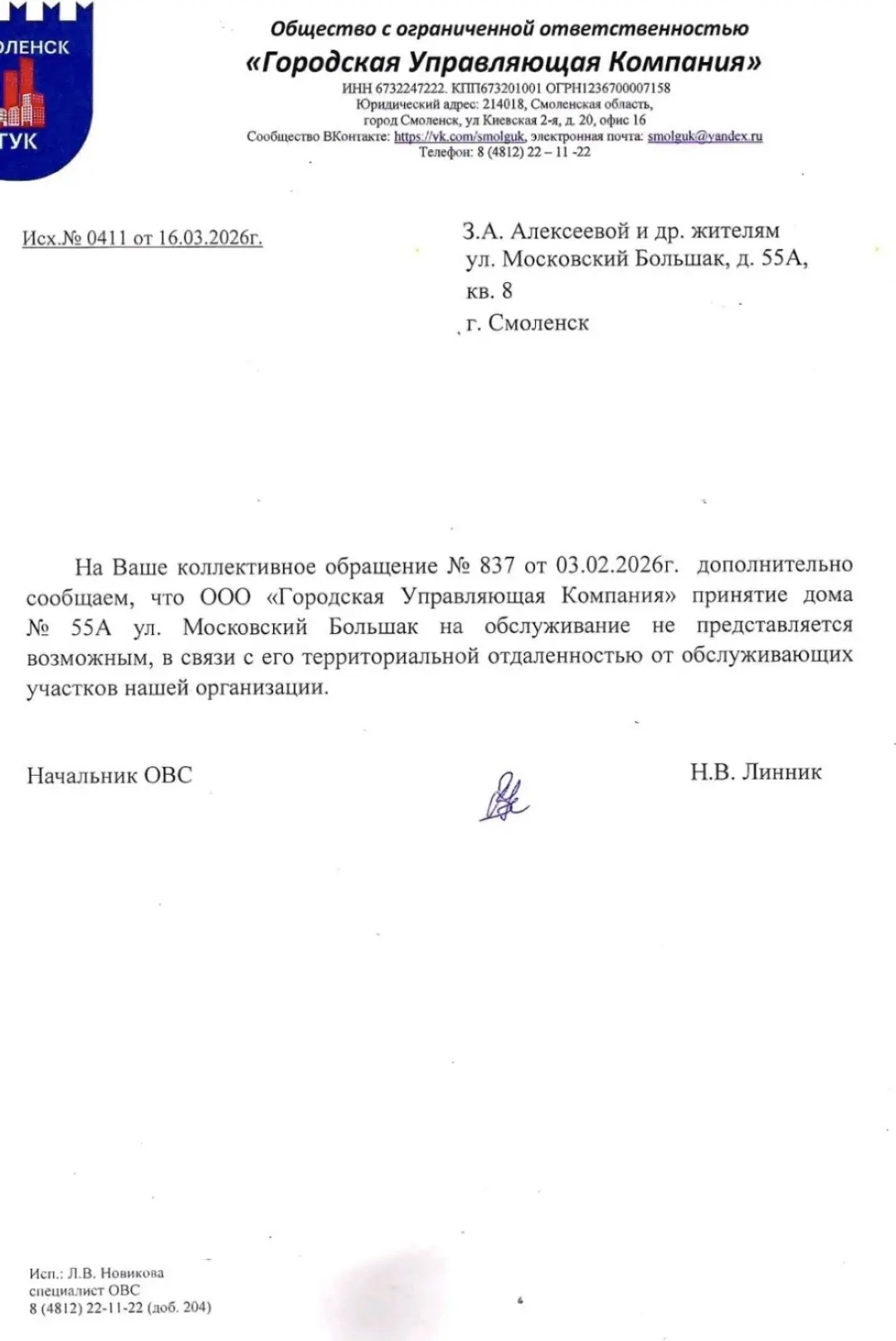 ⚡️Хочу придать огласке вопиющий случай. 14января 2026г по ул Московский Большак д 55а произошел пожар, возгорание эл.щитка в подъезде. Дом 1959г в нем проживают пенсионеры, ветераны труда и люди с ограниченными возможностями. В связи с пожаром управляющая компания ООО город в одностороннем порядке расторгла договор, чтобы не устранять последствия, люди 67 лет платили коммунальные услуги, а как произошел пожар, так дом управляющая компания кинула. Мы обращались в Жилищник, писали заявления, просили чтобы дом приняли на баланс обслуживания в ГУК, никакая управляющая компания не хочет брать. Везде пишут отписки. Дом находиться в аварийном состояние, не отвечает технике безопасности, что служит угрожающим фактором проживания в данном доме. С потолка обсыпается штукатурка на голову, торчат в открытом доступе провода. Просим администрацию срочно принять меры!