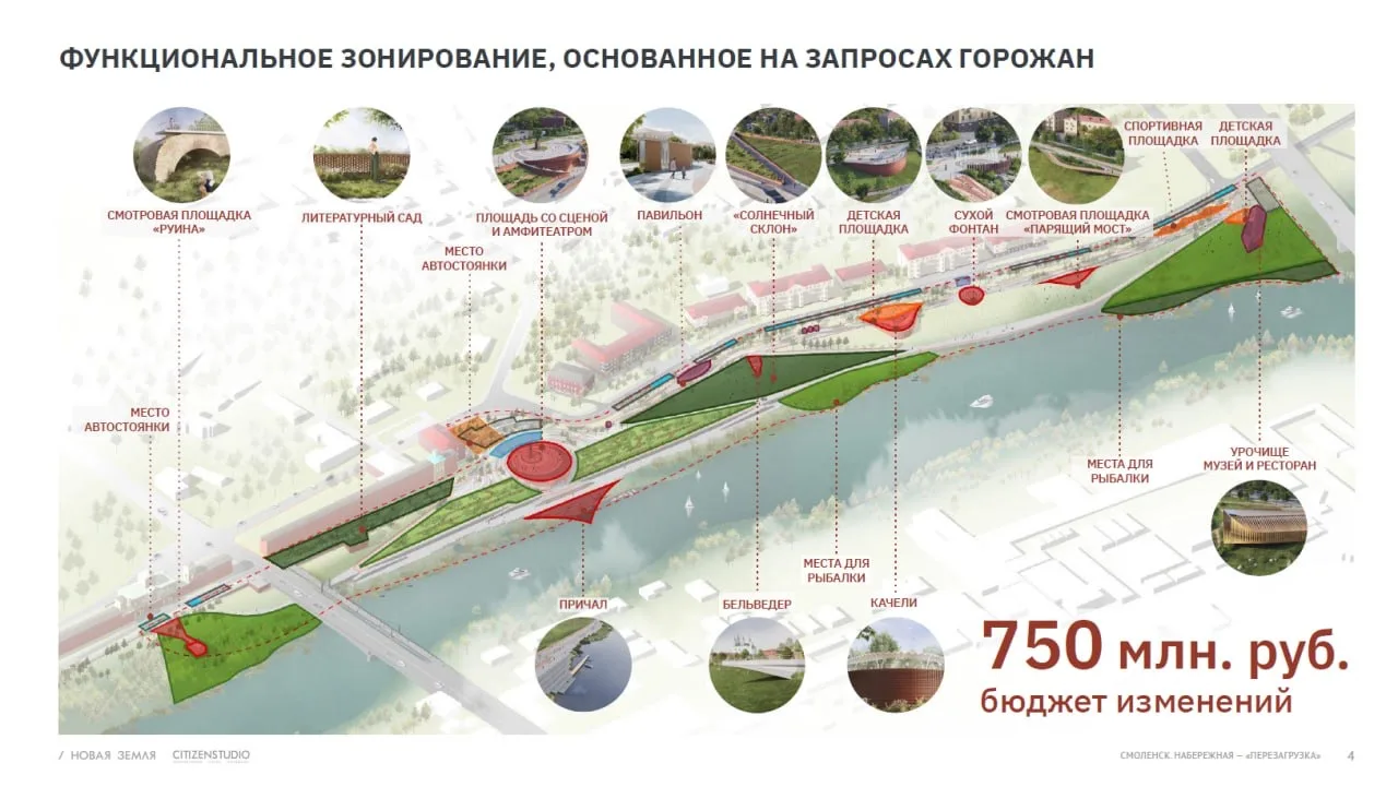 Проект включает функциональные зоны по запросам горожан. Среди ключевых идей: смотровая площадка «Руина», площадь со сценой и амфитеатром, «парящий мост» и сухой фонтан. Также планируются литературный сад, спорткомплекс, причал, музей и ресторан. Стоимость работ оценивается в 750 млн рублей.
