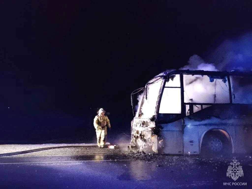 В работе по ликвидации огня были задействованы 4 пожарных на 2 автоцистернах.В автобусе находилось 22 человека и 2 водителя, вышли самостоятельно, пострадавших нет, - сообщает ГУ МЧС по ераю