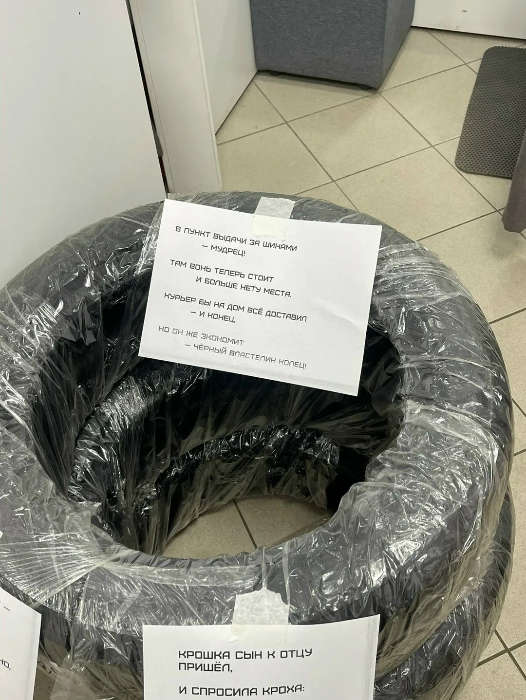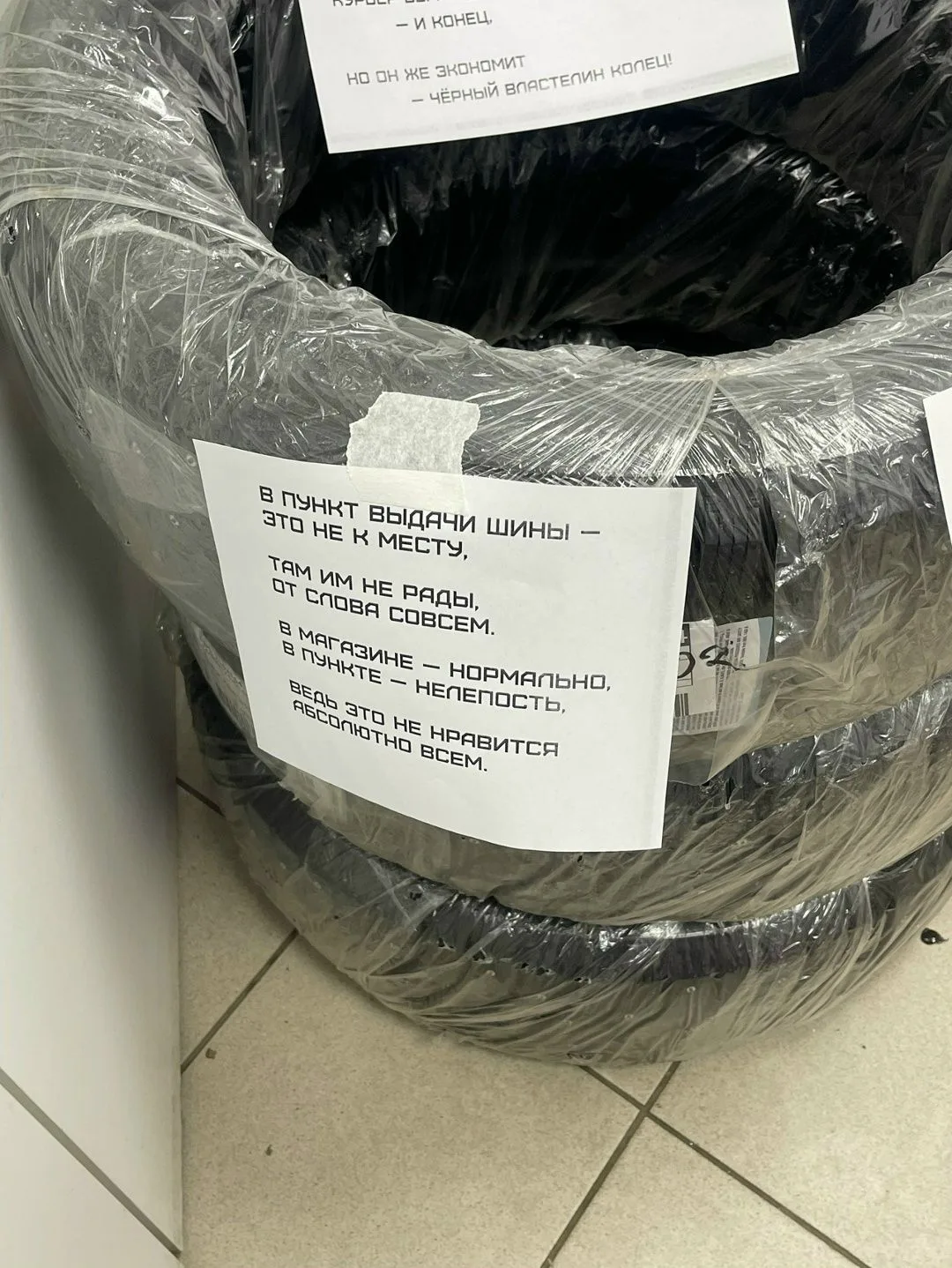 Входишь — а там стопка шин, перевязанных скотчем, вокруг стихи, а запах стоит такой, будто резиновый завод решил открыть филиал прямо в пункте выдачи. Честно, я сначала подумал, что это арт-инсталляция: "Колёса, которые устали ждать владельца". И сотрудники ПВЗ, похоже, тоже устали — судя по стихам, вдохновение к ним пришло раньше, чем заказчик.