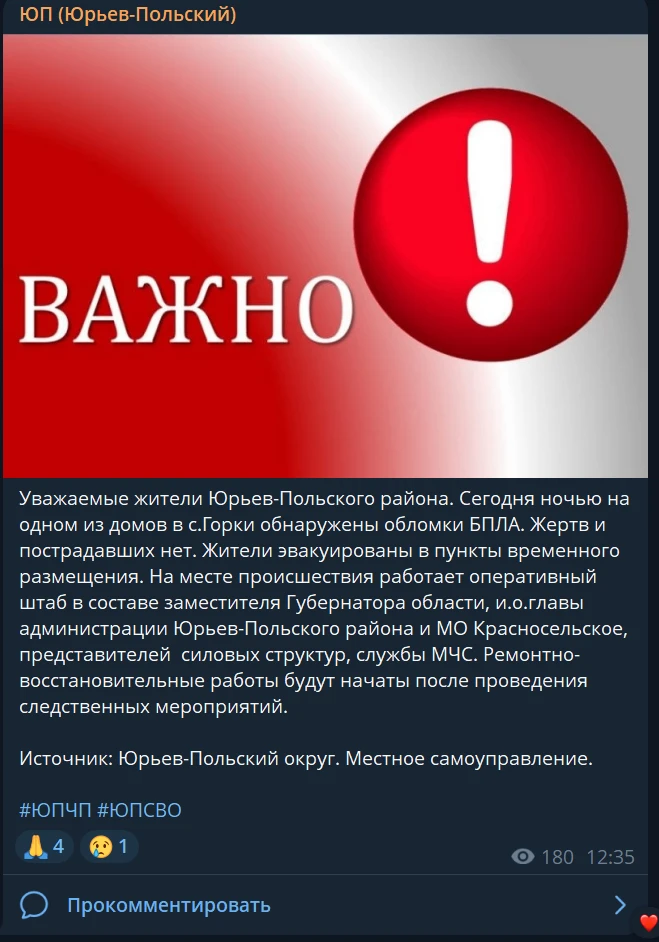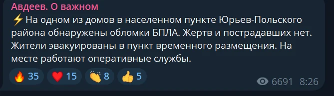 «На одном из домов в населенном пункте Юрьев-Польского района обнаружены обломки БПЛА. Жертв и пострадавших нет. Жители эвакуированы в пункт временного размещения. На месте работают оперативные службы».