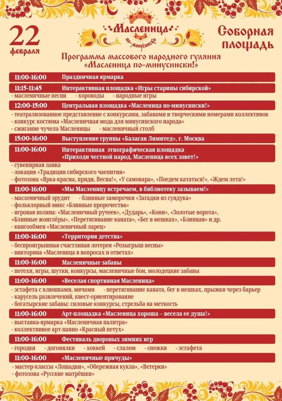 Народные гуляния пройдут 22 февраля с 11-00 до 16-00 на Соборной площади.