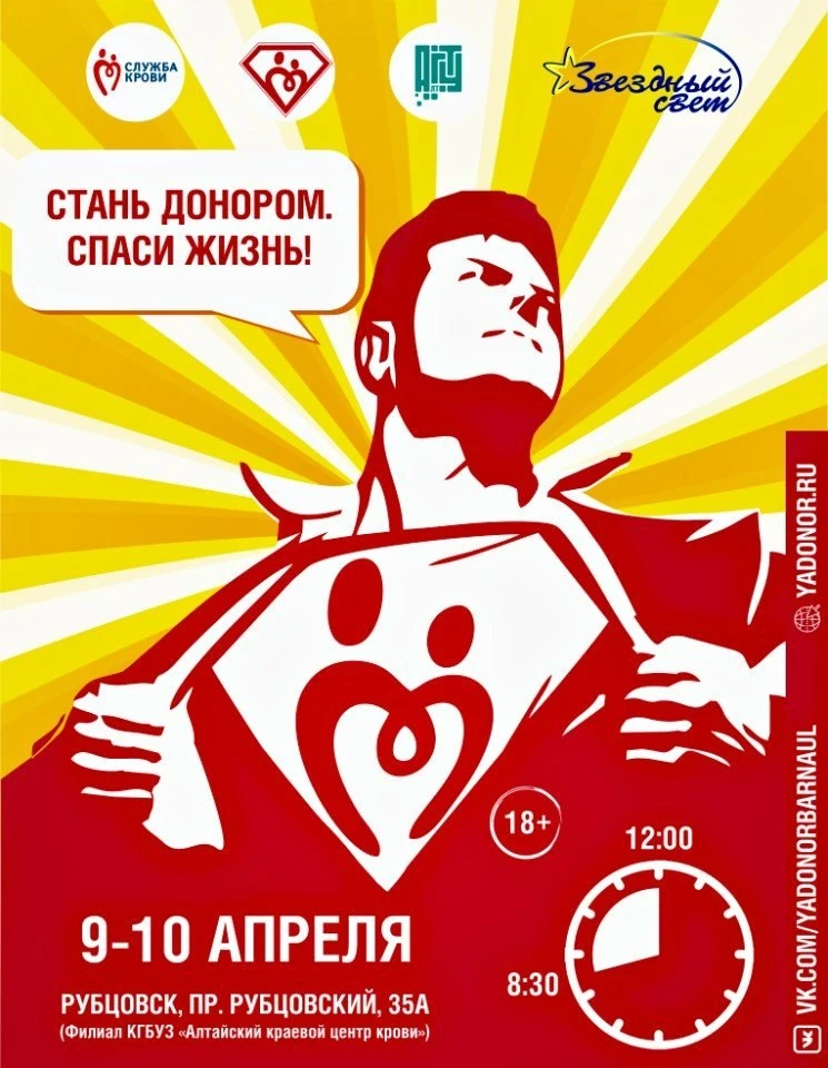 9 и 10 апреля в Рубцовске пройдет весенняя ежегодная акция «Стань донором. Спаси жизнь!», сообщает "Местное Время".