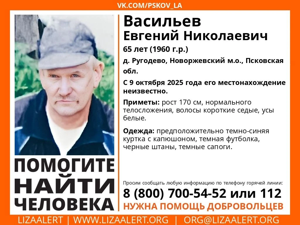 65-летний Евгения Васильева из деревни Ругодево Новоржевского округа разыскивают поисковики из отряда «ЛизаАлерт». Его местонахождение неизвестно с 9 октября.