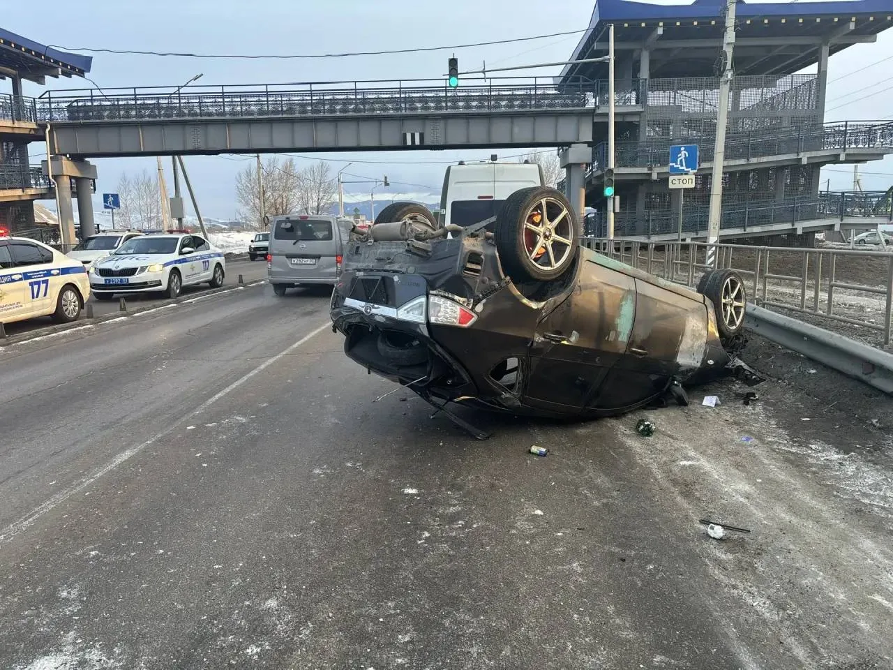 Сегодня утром на улице Тополиной 21-летний водитель «Subaru» столкнулся с припаркованным автомобилем «Hyundai Solaris», остановившимся перед светофором. В результате столкновения машина перевернулась.