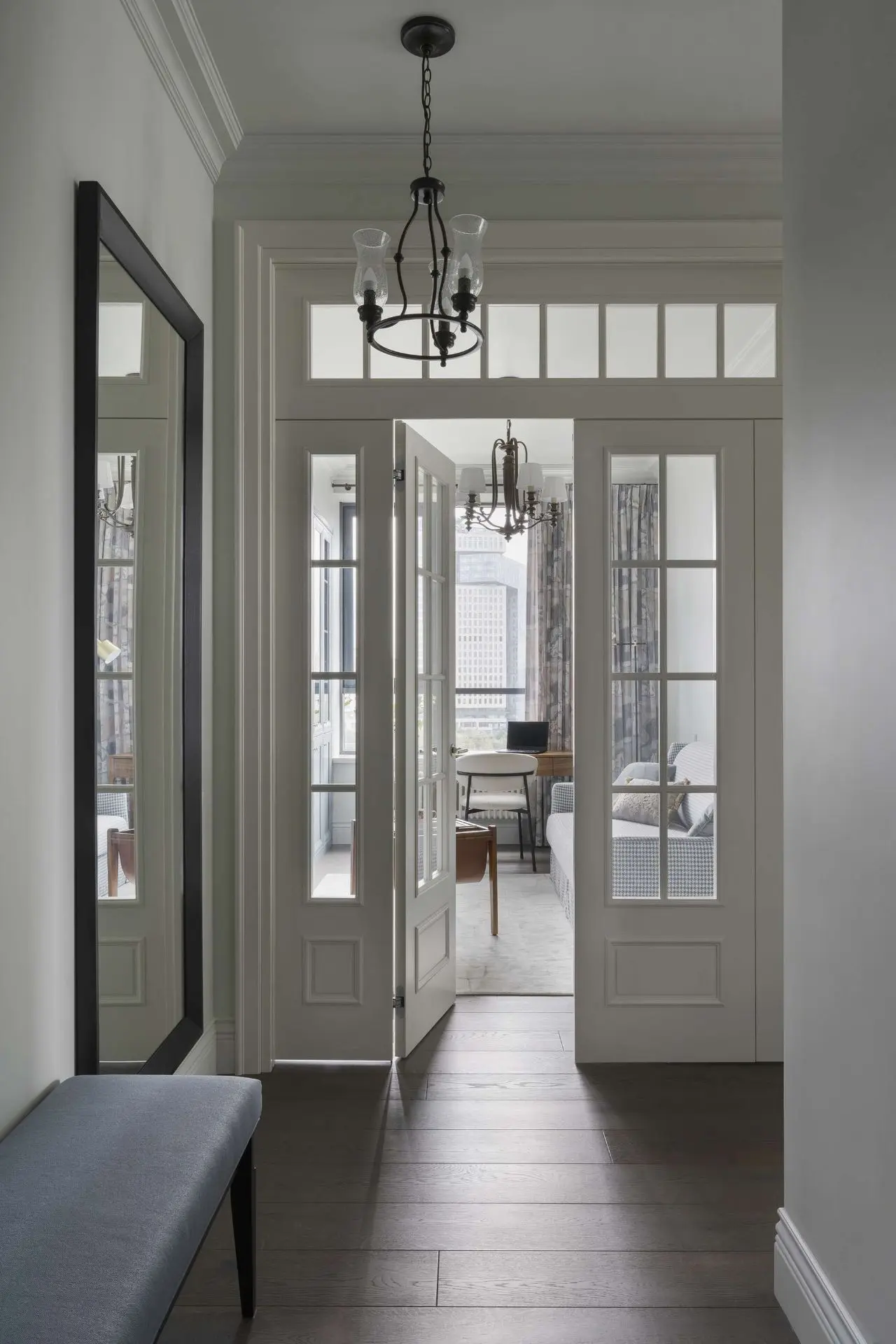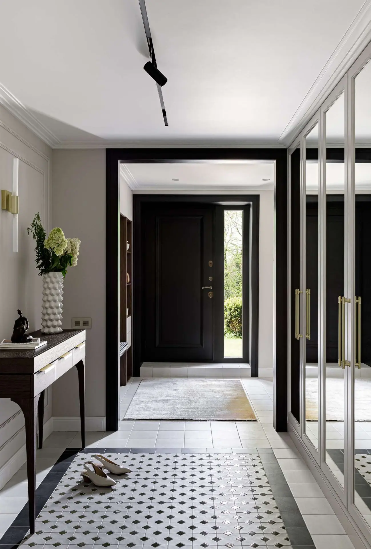 Дизайнер Наталья Митракова оформила интерьер, сочетающий современную классику с выразительными, но сдержанными акцентами. Заказчица проживает в квартире одна и пожелала получить светлое и лаконичное пространство в классическом стиле с контрастными деталями: темным полом и элементами из темного металла в отделке освещения и мебели. Она предпочитает простые формы, удобные предметы и избегает декоративных излишеств.