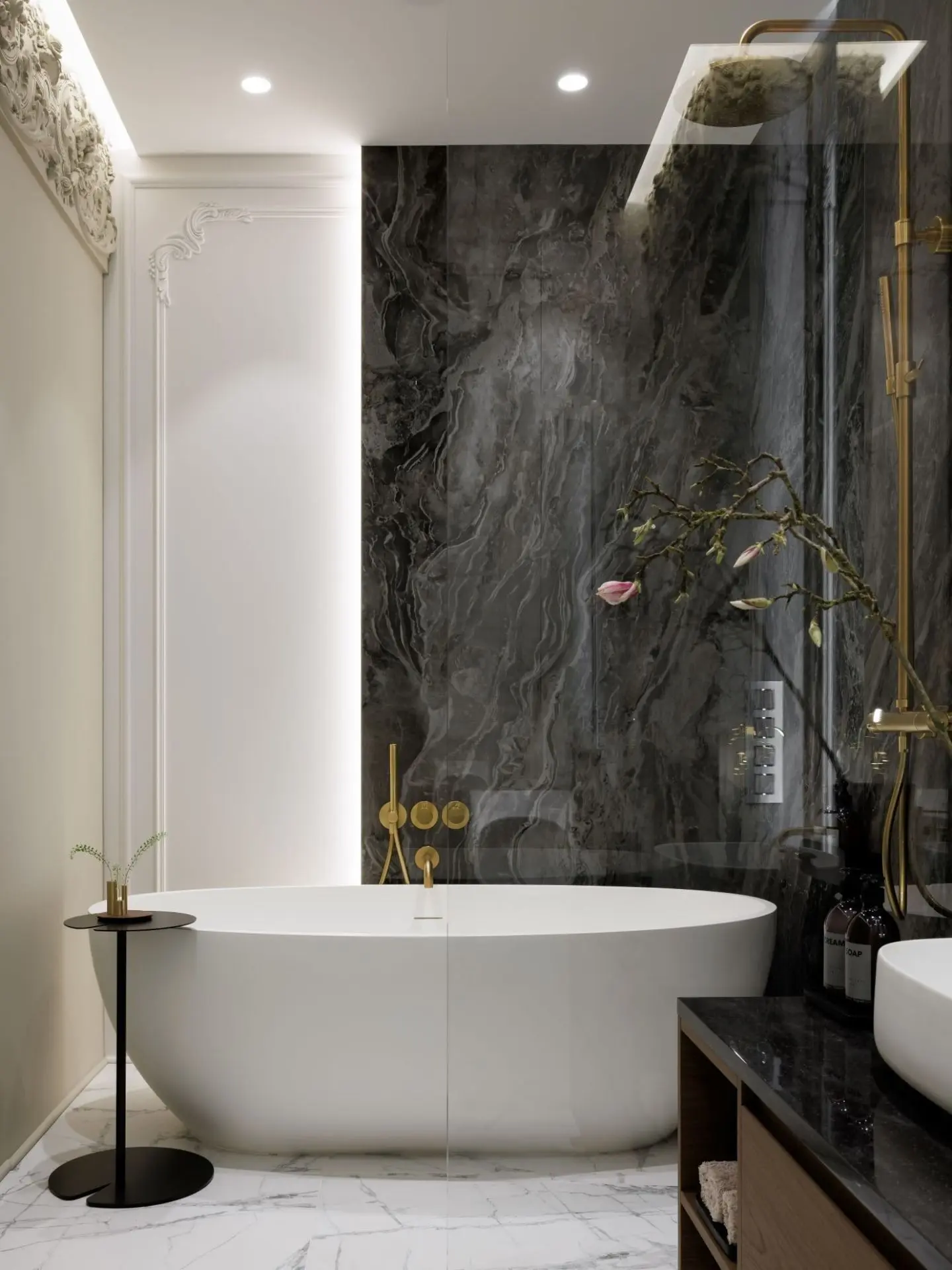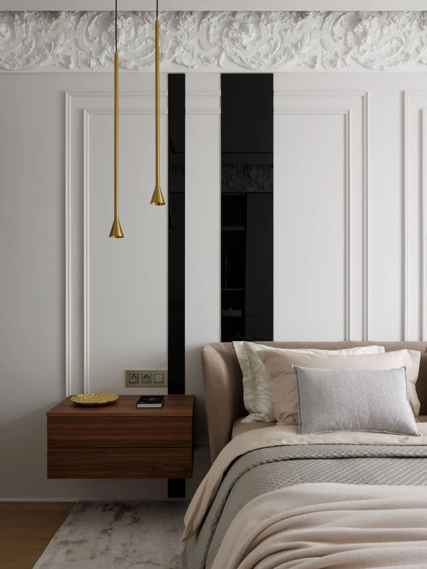 Заказчики — семья с дочерью, проживающая в Москве, — приобрели жилье с целью создать «петербургскую квартиру», но без излишеств. В интерьере требовалось подчеркнуть атмосферу города, избегая при этом доминирования классического стиля. Исходя из этого, дизайнером Еленой Лебедевой было сформировано стилевое решение: в основу легли лепнина и фриз, «разбавленные» современным технологичным оснащением.