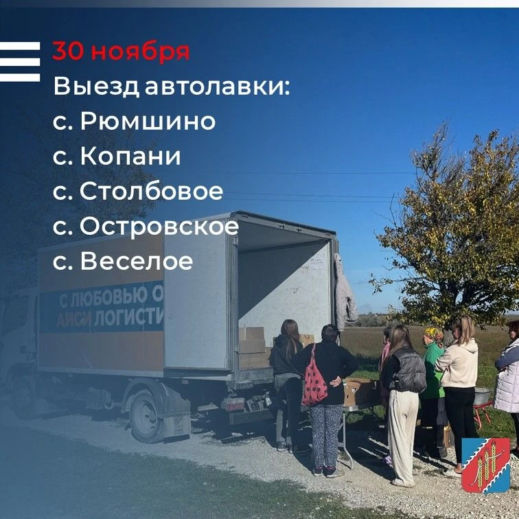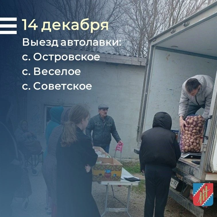 В воскресенье, 14 декабря, планируется выезд автолавки в с. Советское в 10:00, с. Веселое в 11:00 и с. Островское в 12:10.