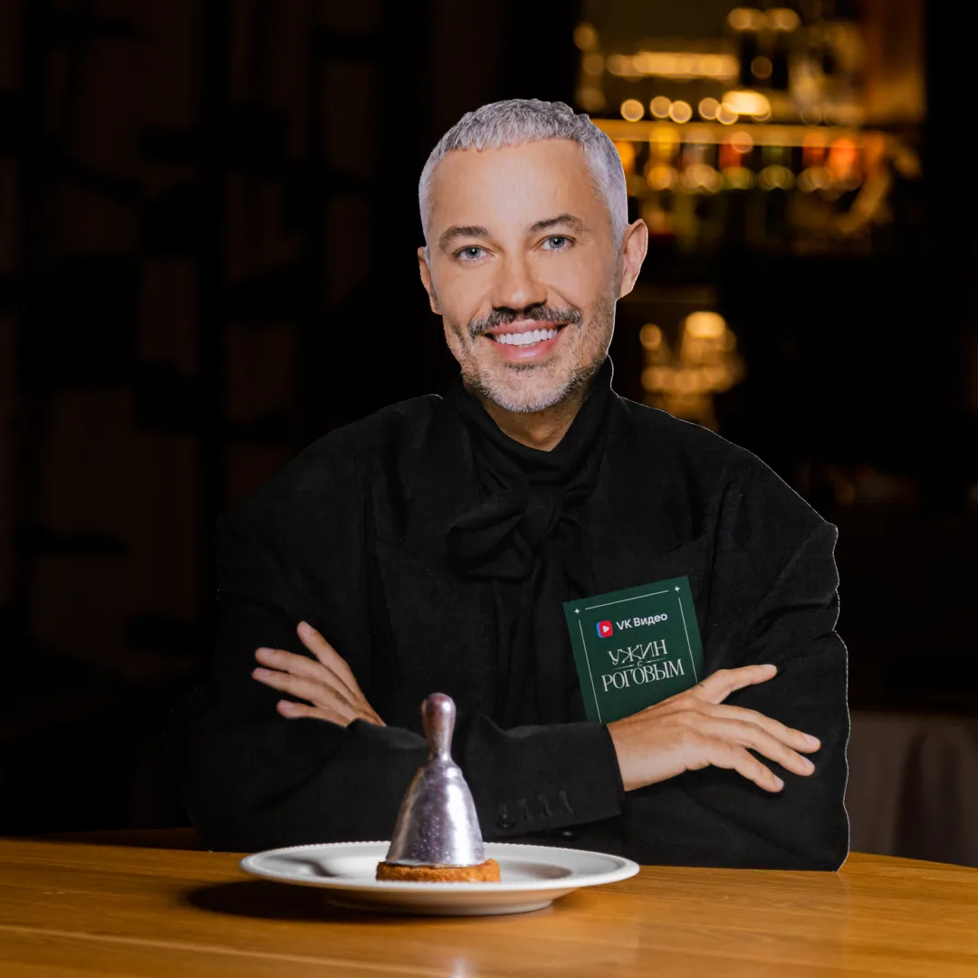 VK Видео и Pinskiy&Co выпустили десерт по мотивам шоу «Ужин с Роговым» — в форме колокольчика, символа дуэли: именно его звоном гости вызывают Александра Рогова на игру.