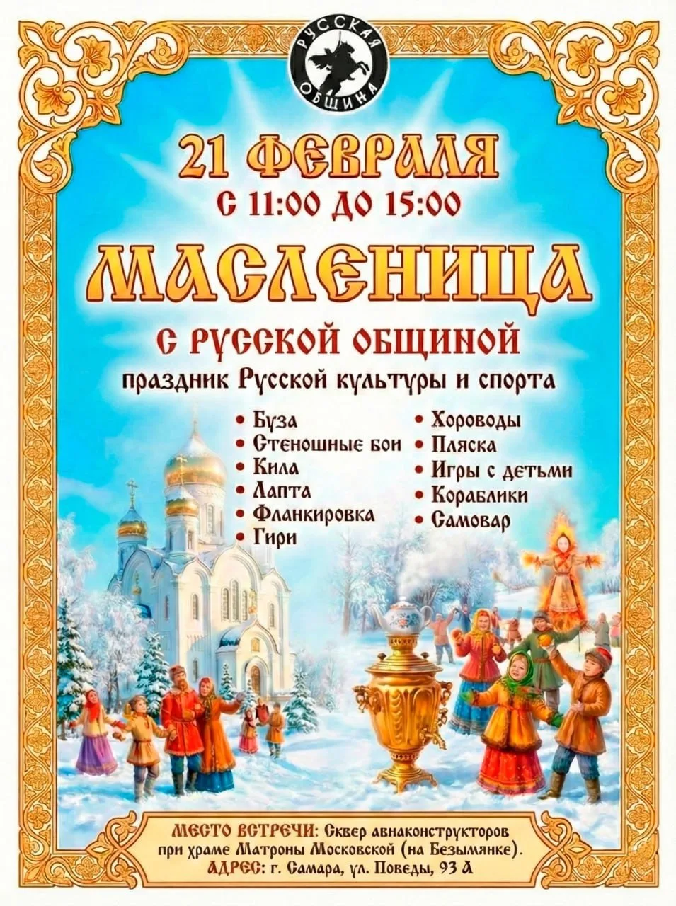 Масленица с Русской Общиной с хороводами, играми, самоваром