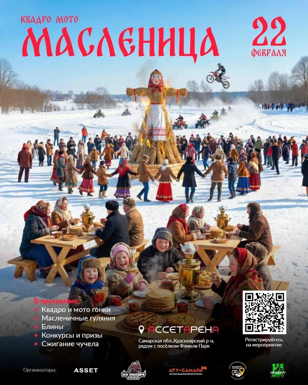 КвадроМасленица с 🔥 сожжением чучела, катанием на тюбинге, угощениями, экстрим-соревнованиями (бесплатно)