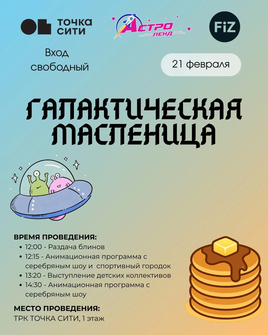 Угощения блинами, серебряное шоу и анимация в Точка Сити (бесплатно)