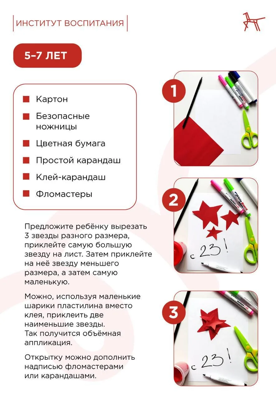 ❣️ В понедельник День защитника Отечества. А значит, выходные можно посвятить подготовке небольших подарков для папы, дедушки или других близких. Предлагаем провести это время вместе с ребёнком и сделать открытку своими руками.